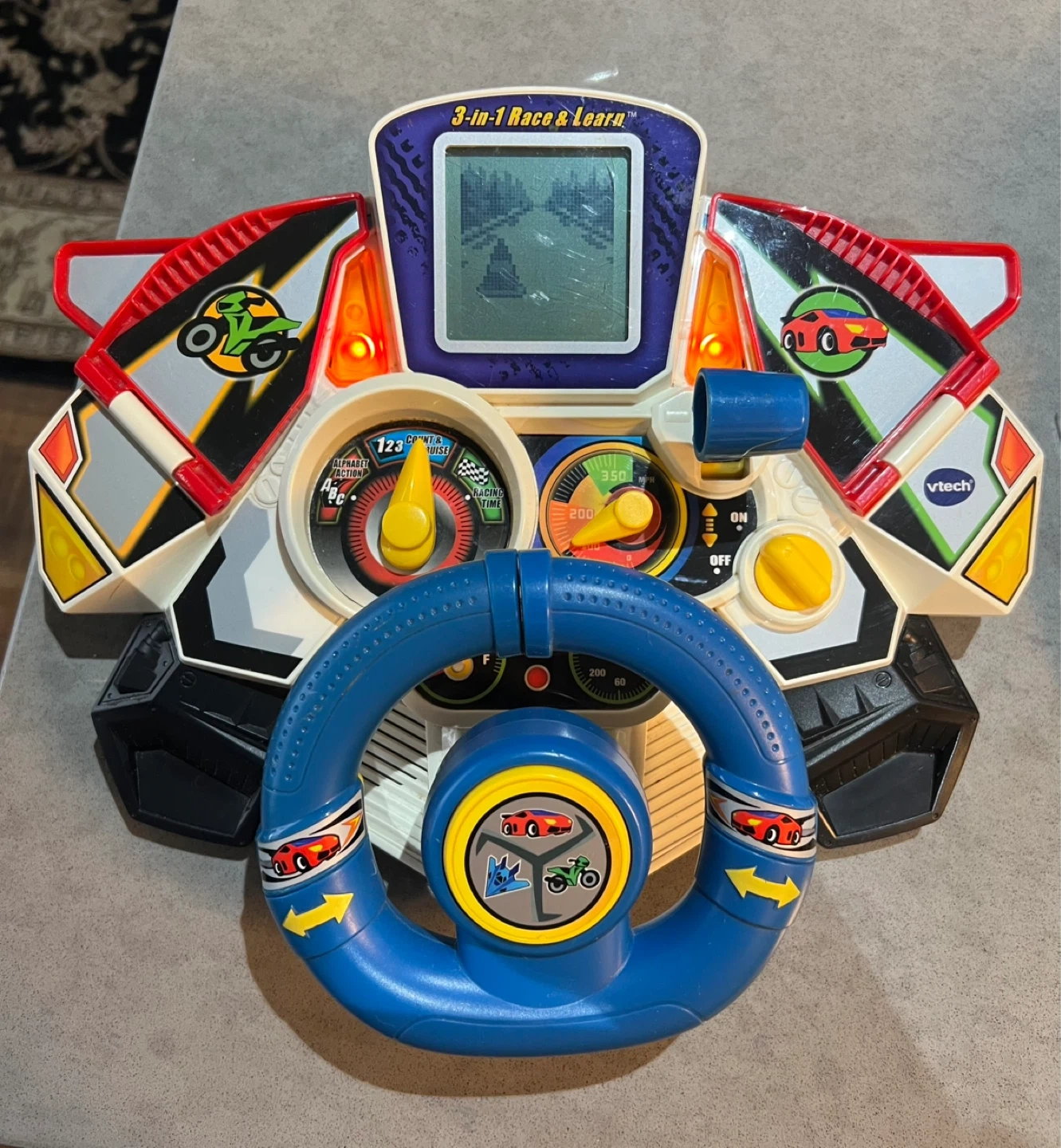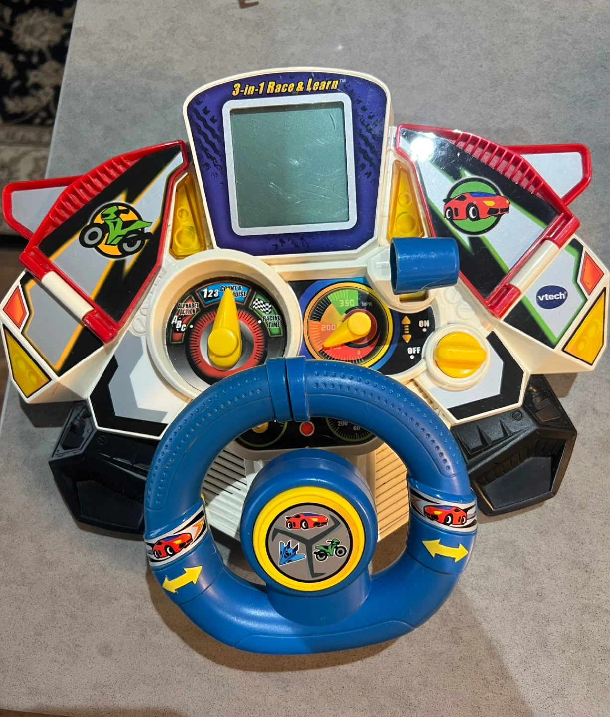 VTech 3-in-1 Race & Learn steering wheel toy for kids. Features a colourful screen and interactive buttons for racing games. Requires batteries for full functionality.great condition