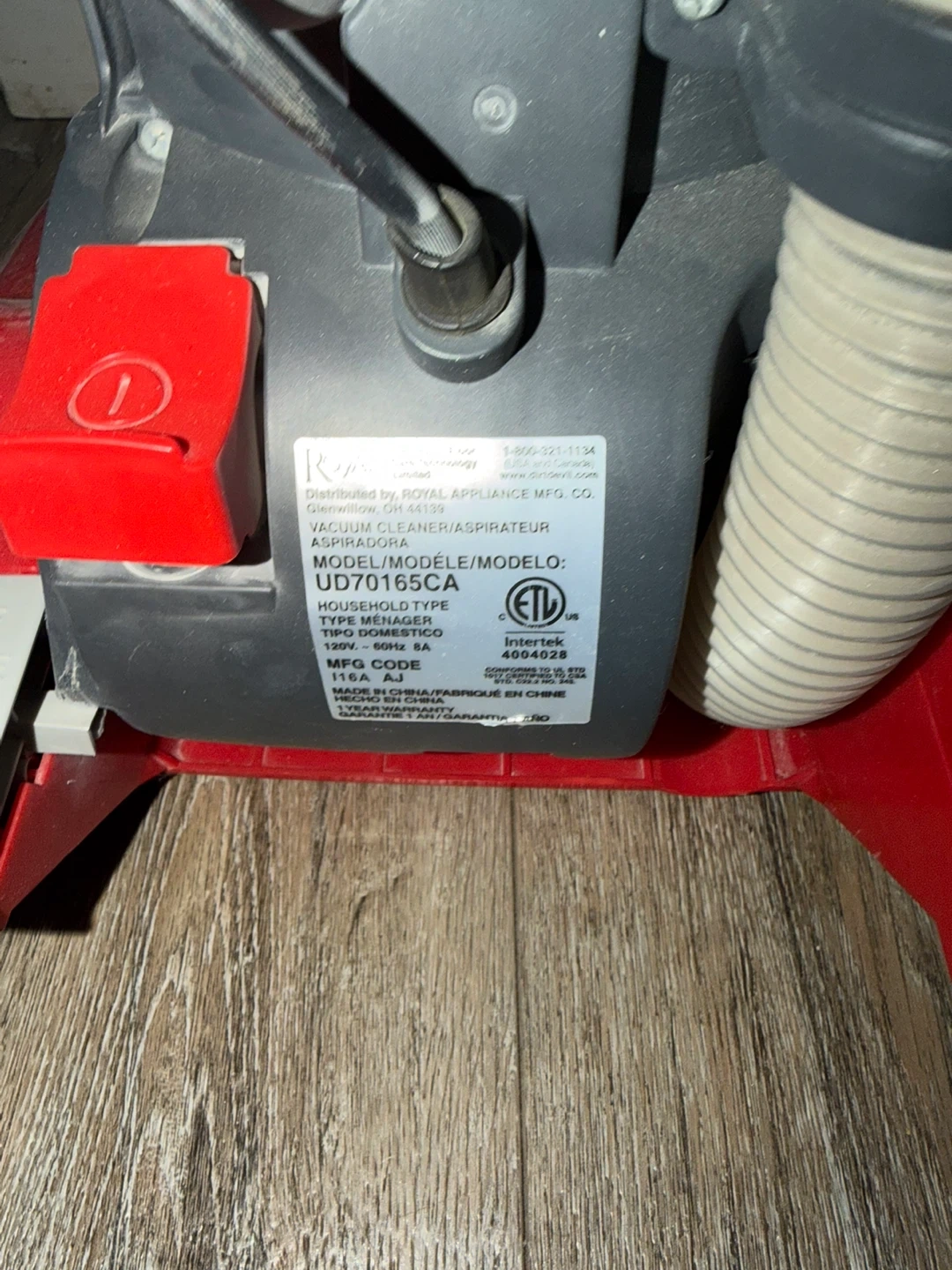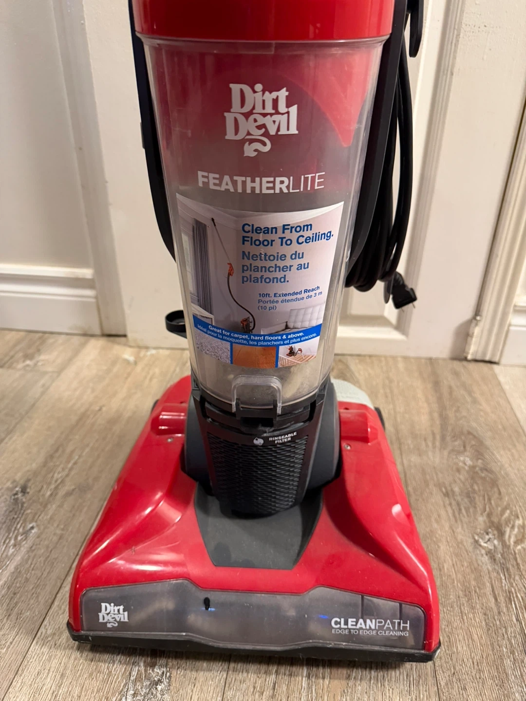 This is a red Dirt Devil FeatherLite bagless vacuum cleaner. It's designed for cleaning from floor to ceiling with a 10ft extended reach. Features a washable filter.