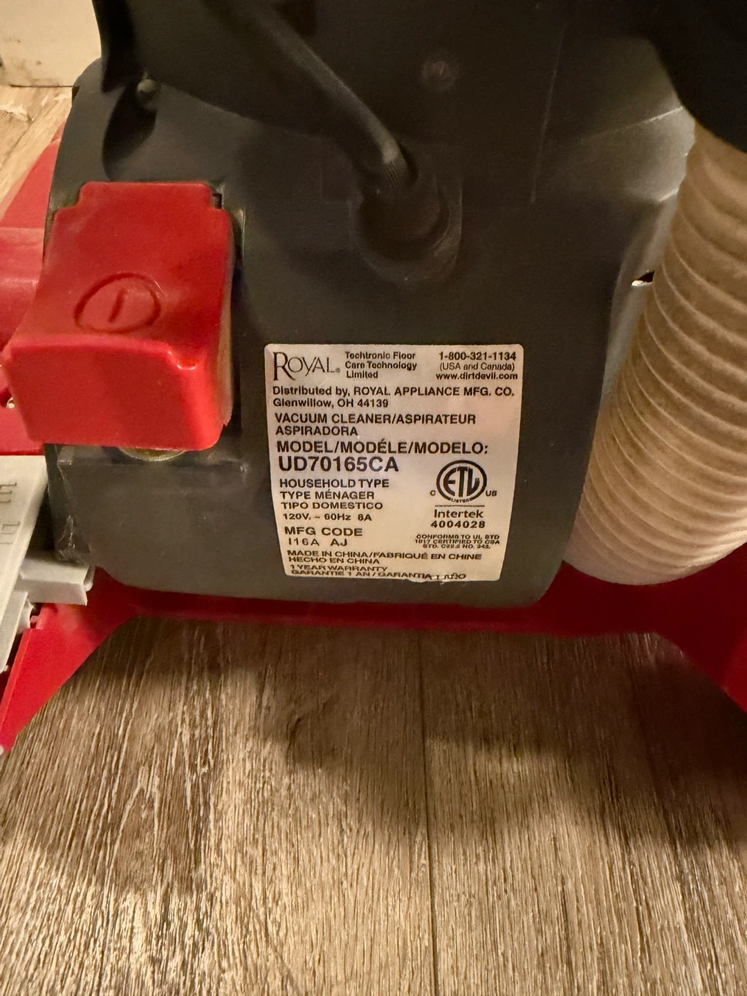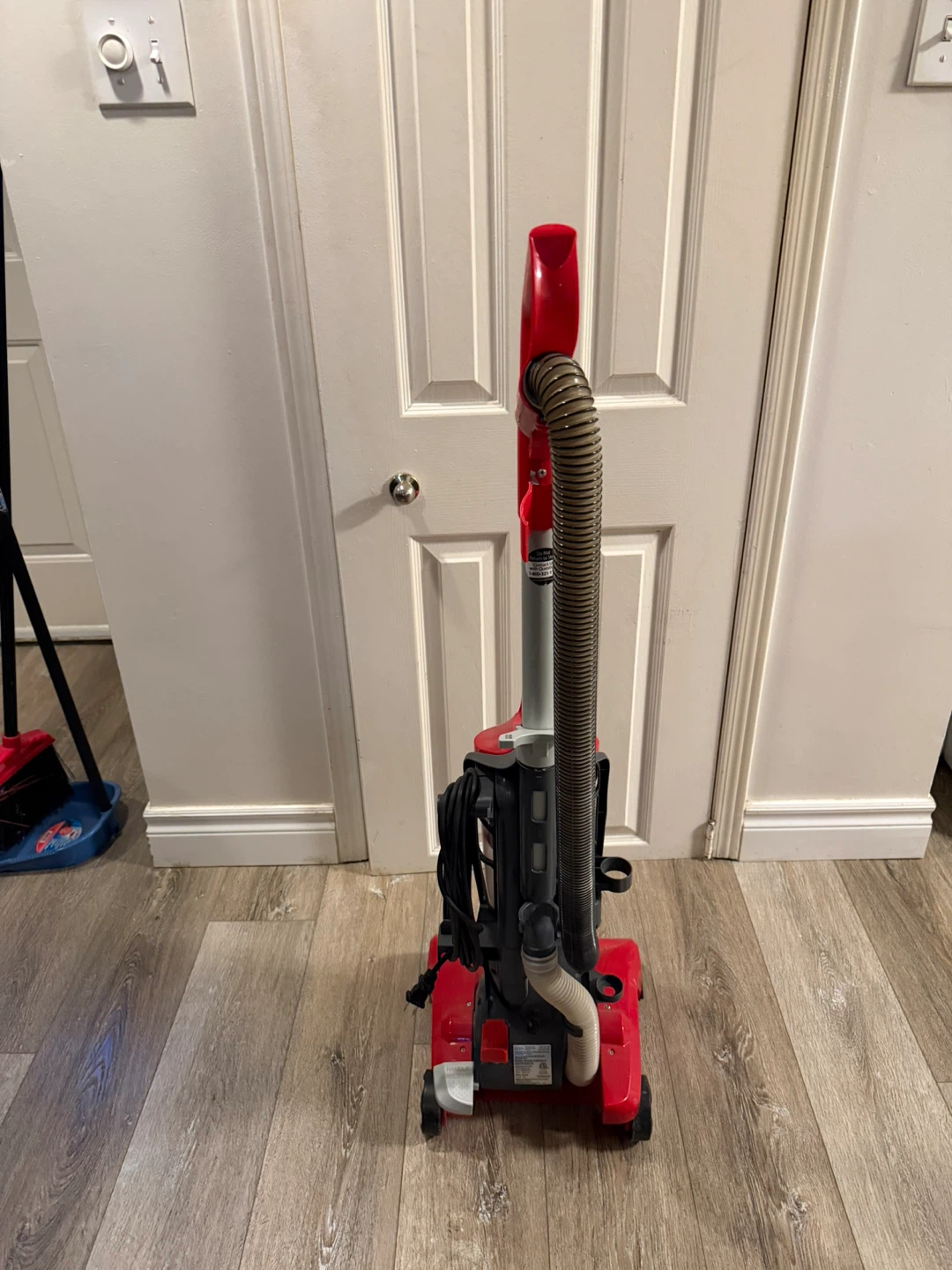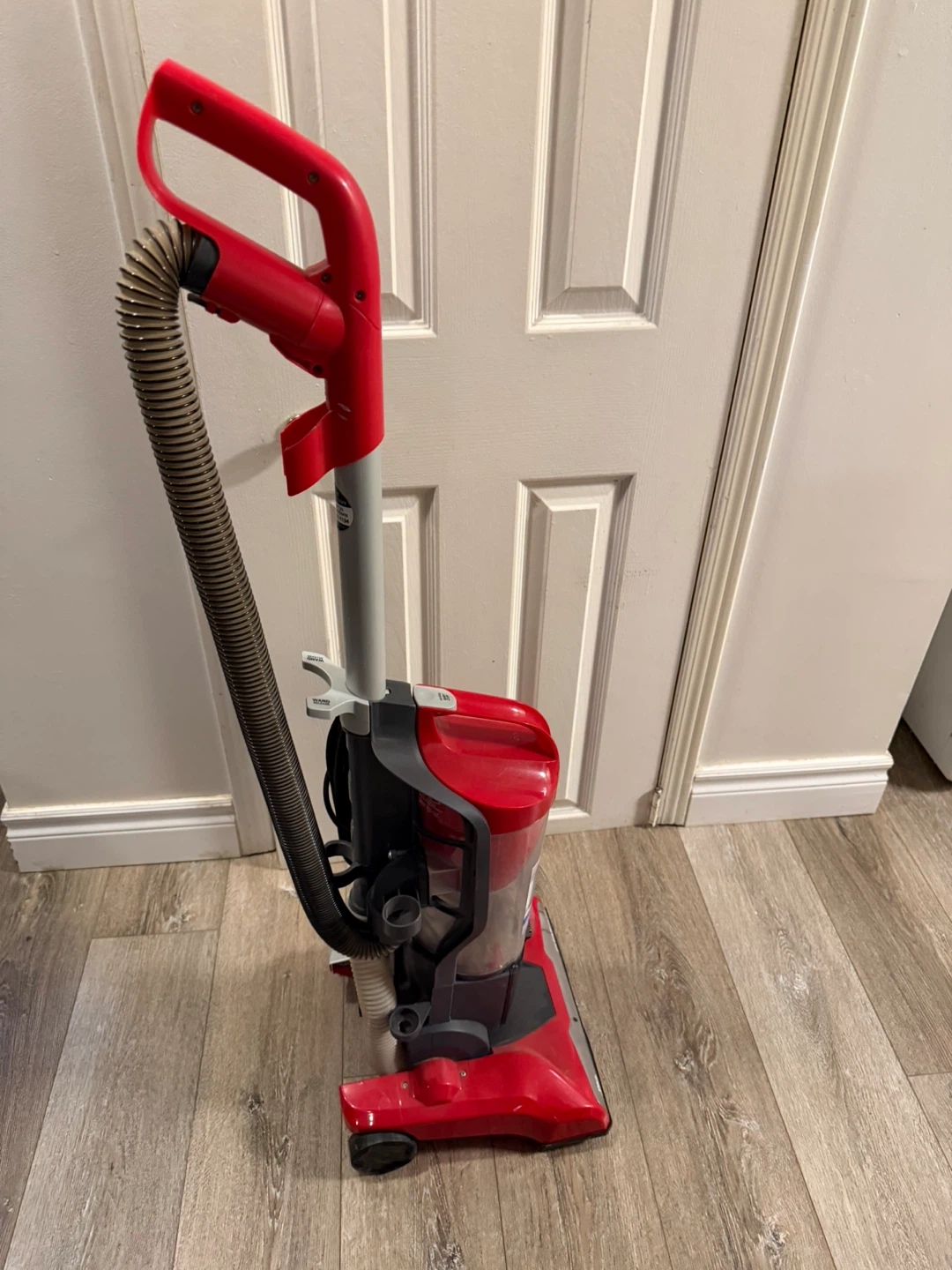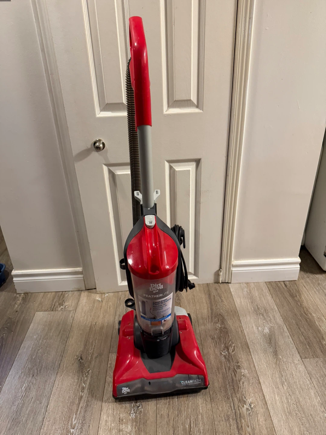 This is a red Dirt Devil FeatherLite bagless vacuum cleaner. It's designed for cleaning from floor to ceiling with a 10ft extended reach. Features a washable filter.