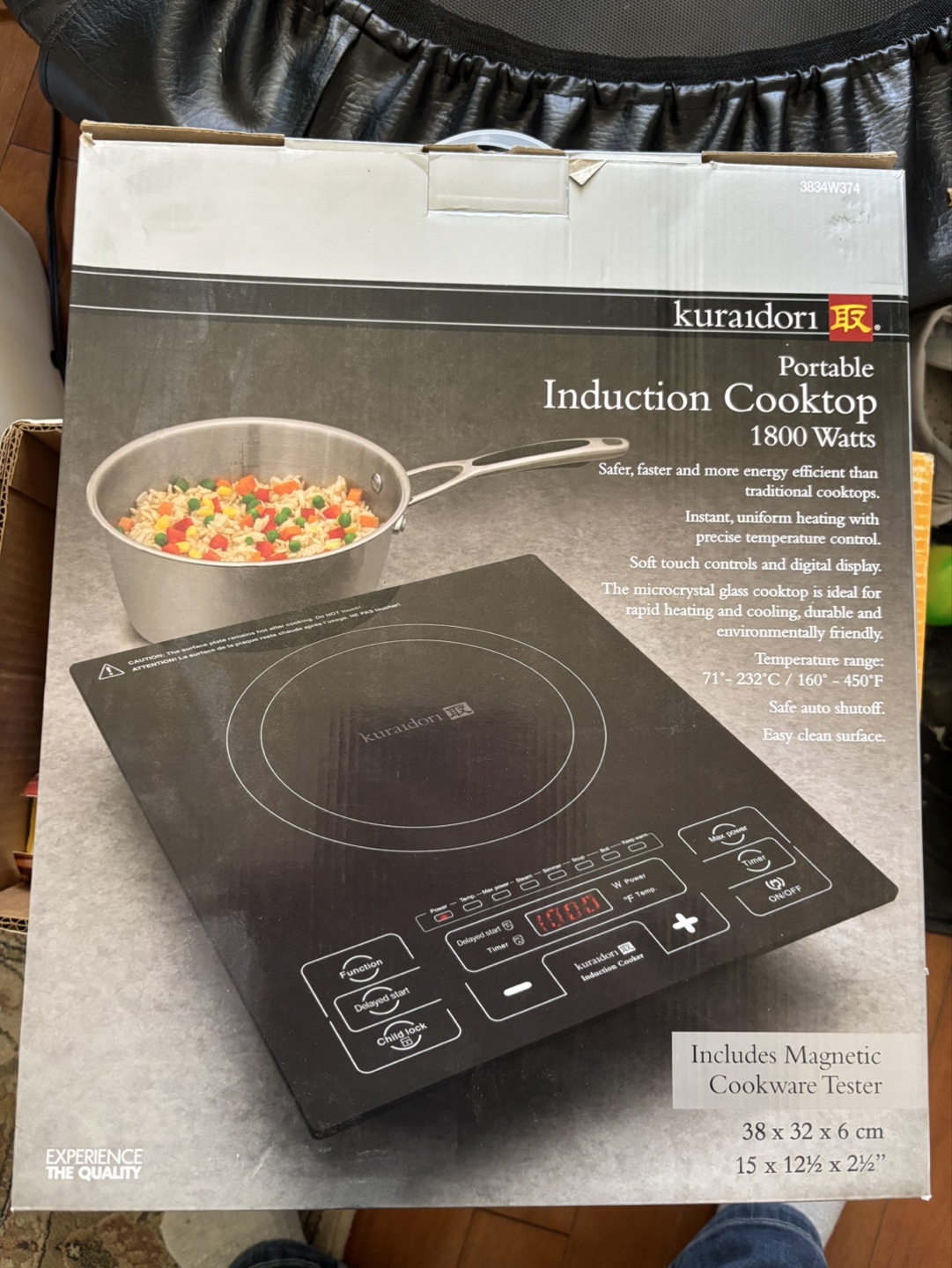 Portable induction cooktop. 1800 watts. Features soft touch controls, digital display, and a microcrystal glass cooktop. Includes magnetic cookware tester. Easy to clean. Used once. No need for it anymore