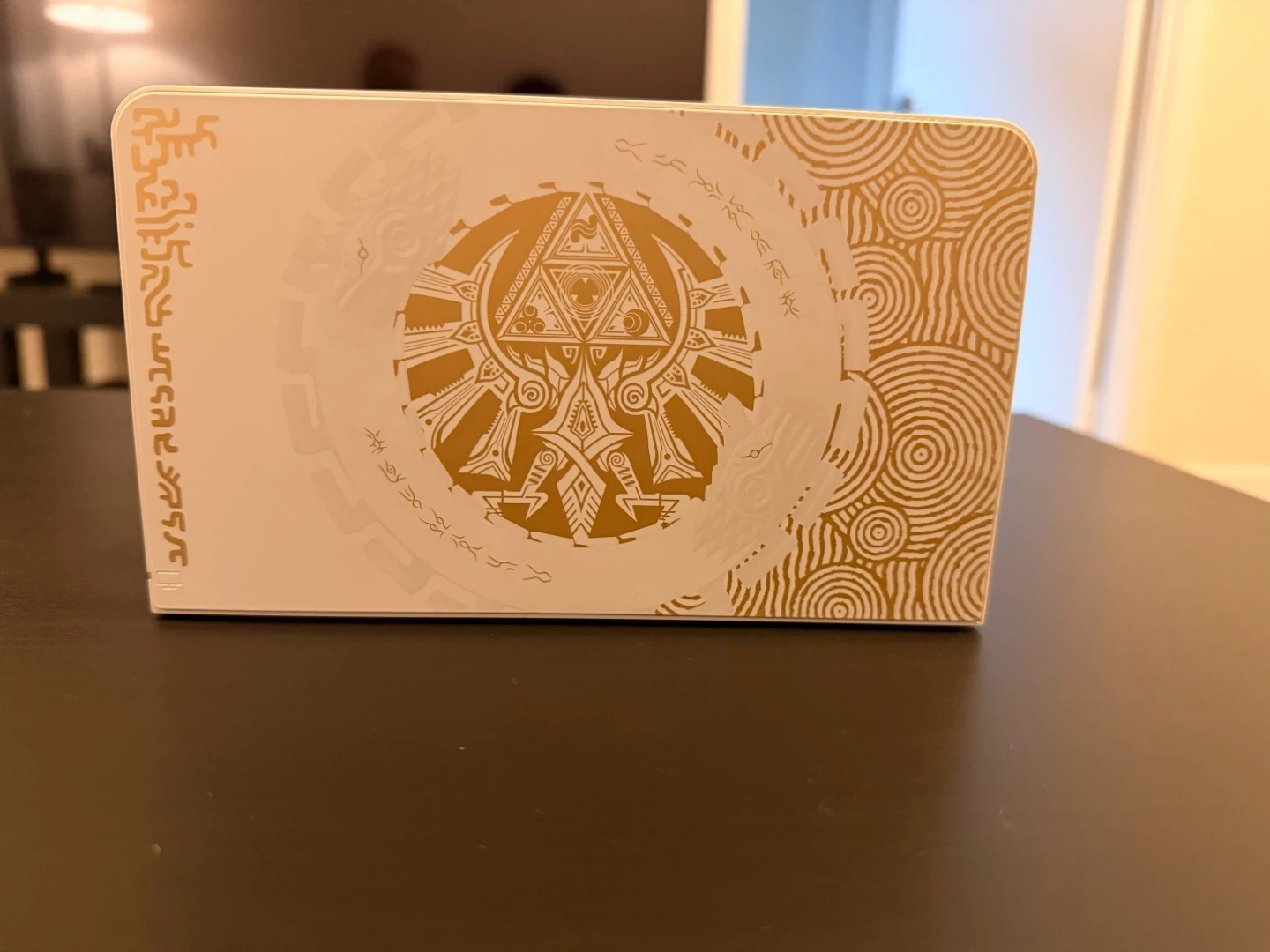 This Nintendo Switch console features a special edition Legend of Zelda themed dock. It includes a pair of gold Joy-Con controllers and a charging grip. A carrying case and all connecting cables are also included.