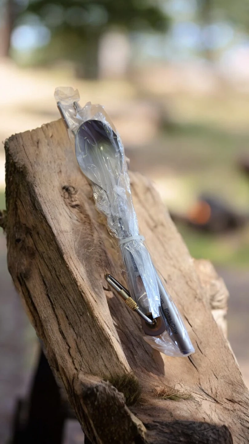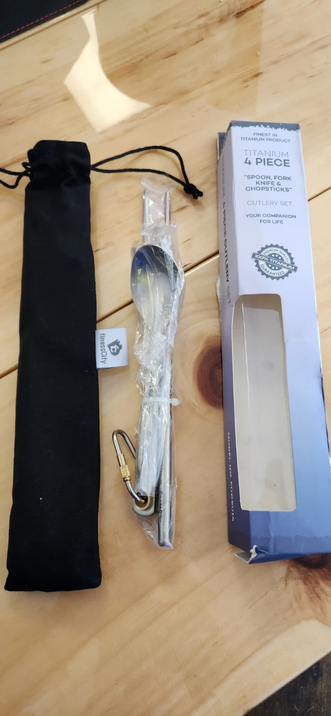 This is a 4-piece titanium cutlery set. It includes a spoon, fork, knife, and chopsticks. It's lightweight and comes with a washable cloth case and carabiner.