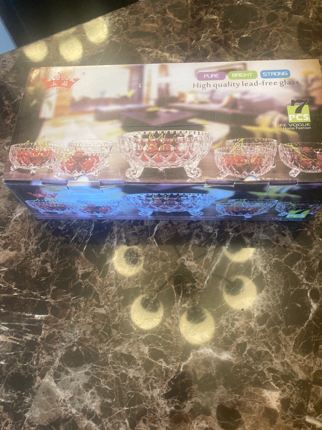 This is a set of six glass bowls. They're made from high-quality lead-free glass. They're pure, bright, and strong. These would be nice for serving desserts or snacks.