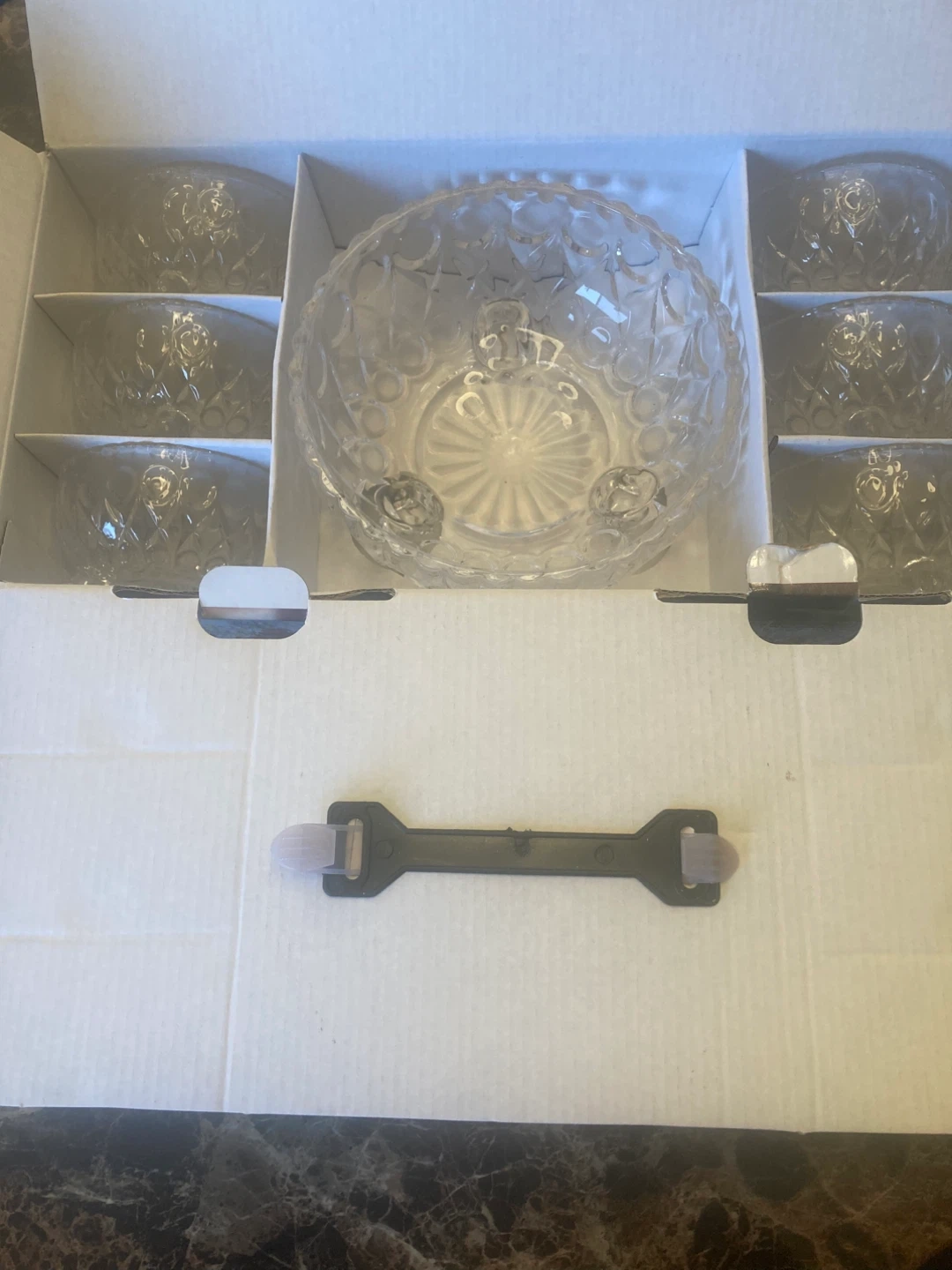 This is a set of six glass bowls. They're made from high-quality lead-free glass. They're pure, bright, and strong. These would be nice for serving desserts or snacks.