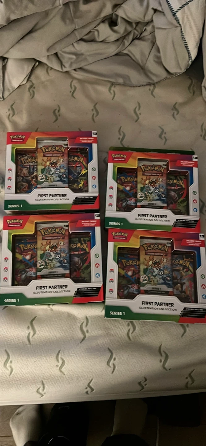 Four brand new Pokémon First Partner Illustration Collection boxes, Series 1. Each box includes 3 Pokémon TCG packs and a promo card. Great for collectors!