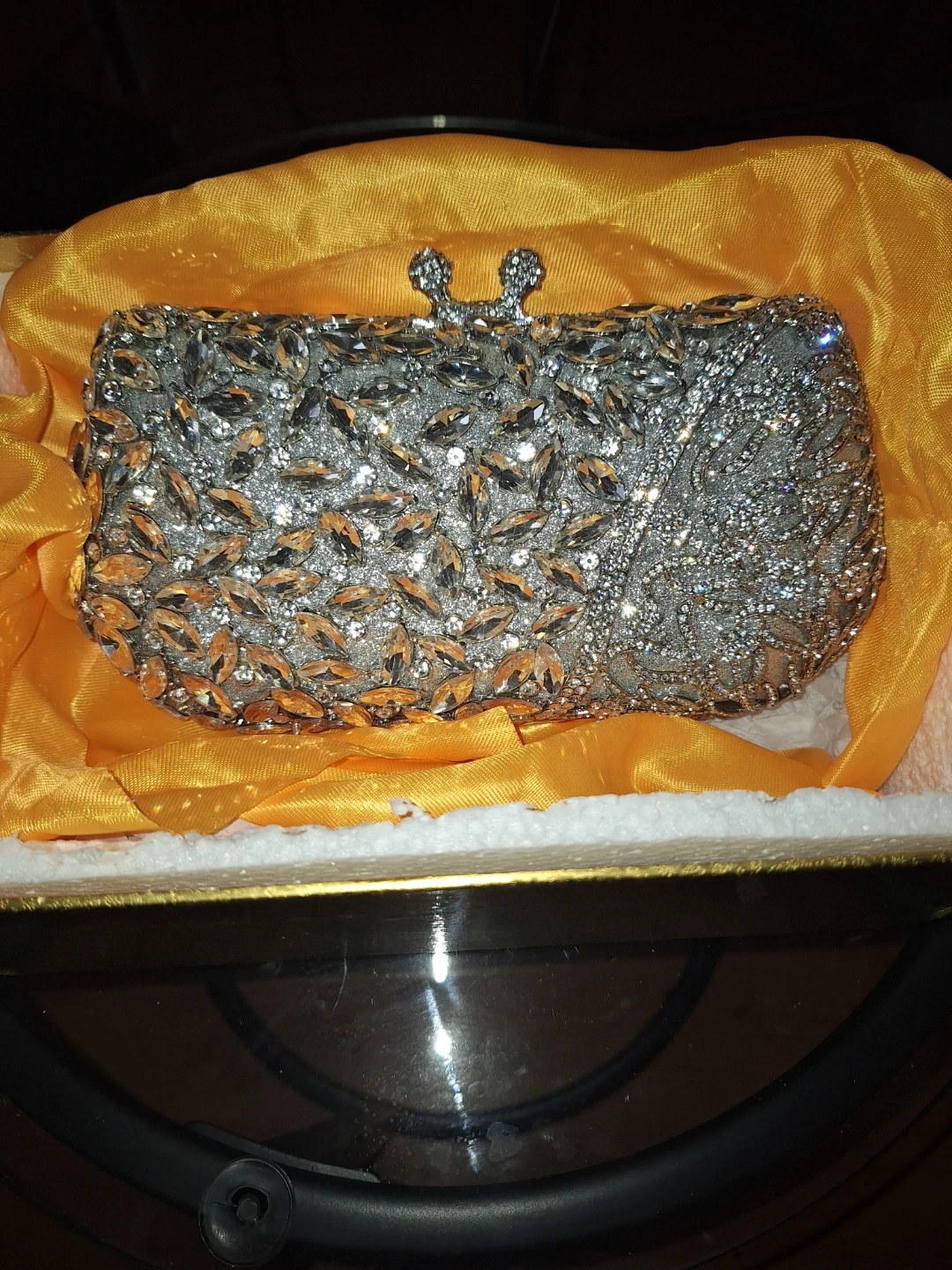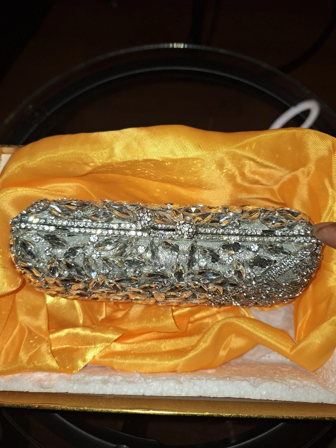 Sparkling rhinestone clutch bag, perfect for special occasions. It's embellished with clear crystals and comes with a silver-tone chain strap and extra rhinestones