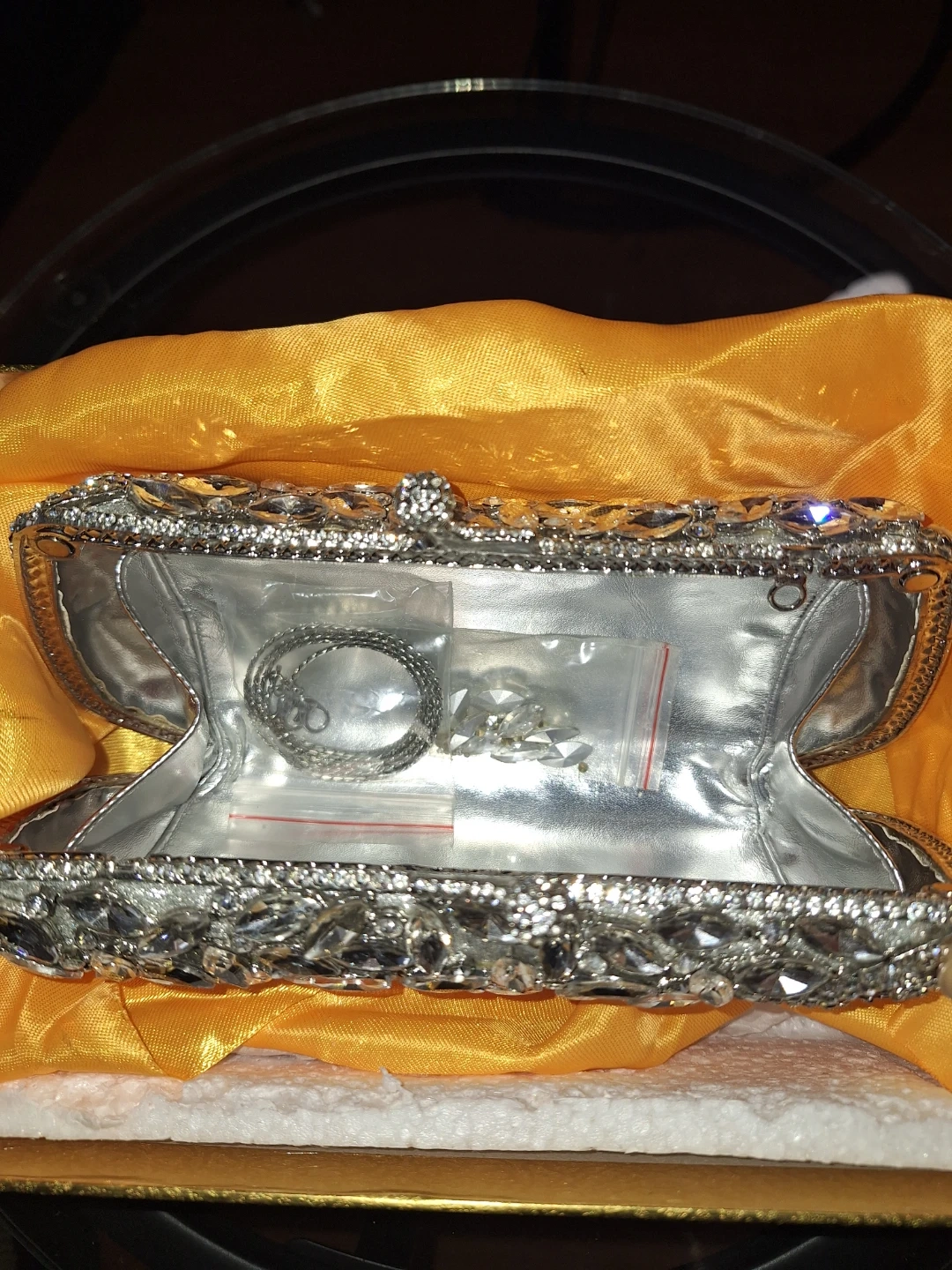 Sparkling rhinestone clutch bag, perfect for special occasions. It's embellished with clear crystals and comes with a silver-tone chain strap and extra rhinestones