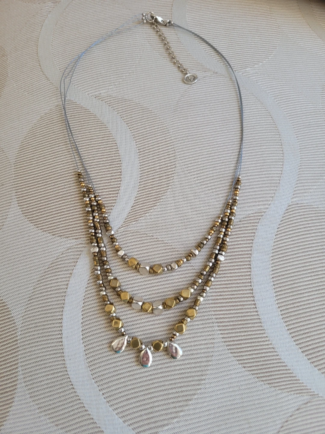 This is a Silpada 16' Sterling Silver three-strand wire bronze beaded necklace. It features a lobster clasp closure with a 2' extender chain. The beads are a mix of cube, teardrop, and round shapes.Boho style.