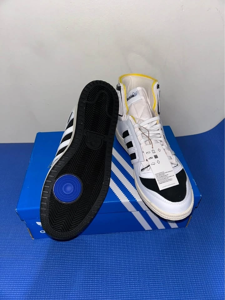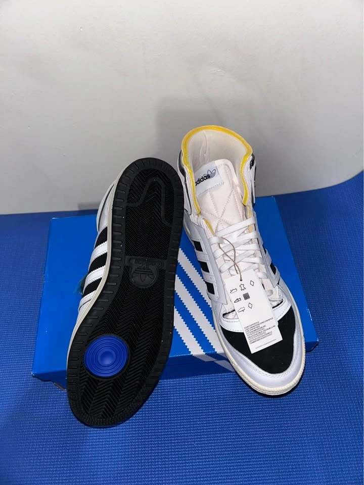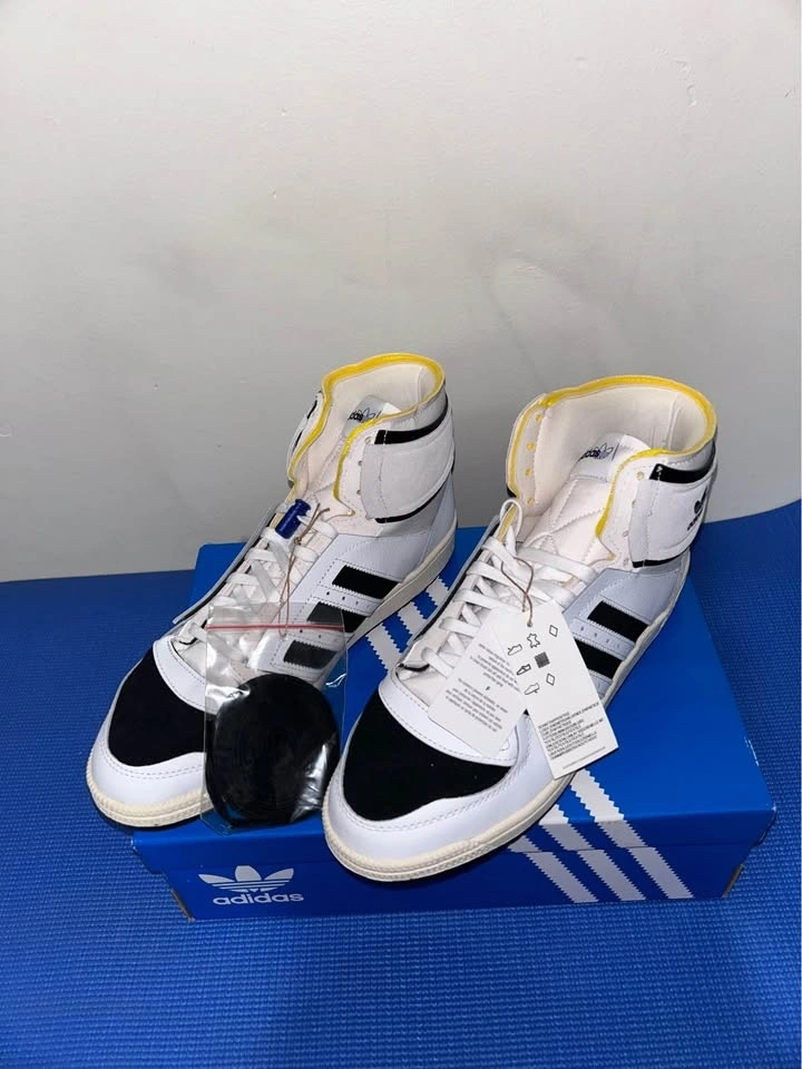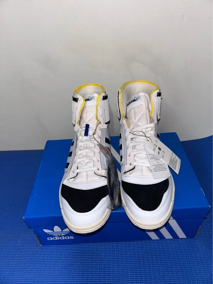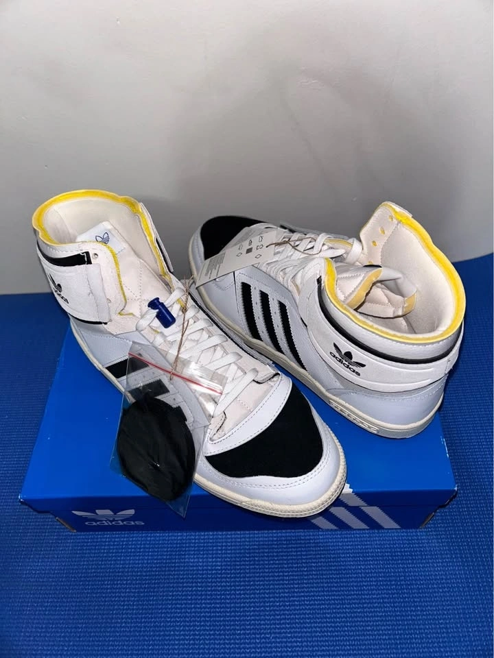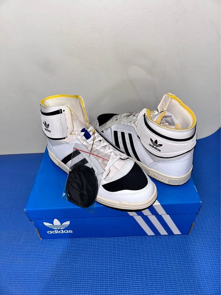 Fresh Adidas Top Ten high top sneakers. White, black, and yellow colorway. New in box with tags still on and extra black laces.