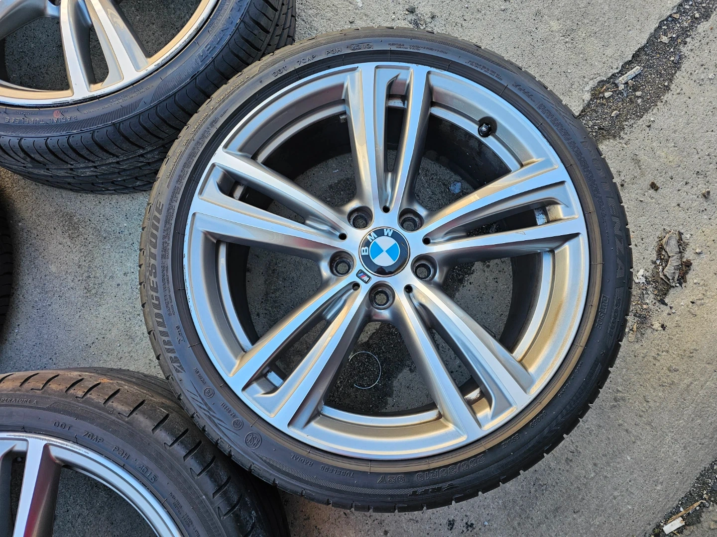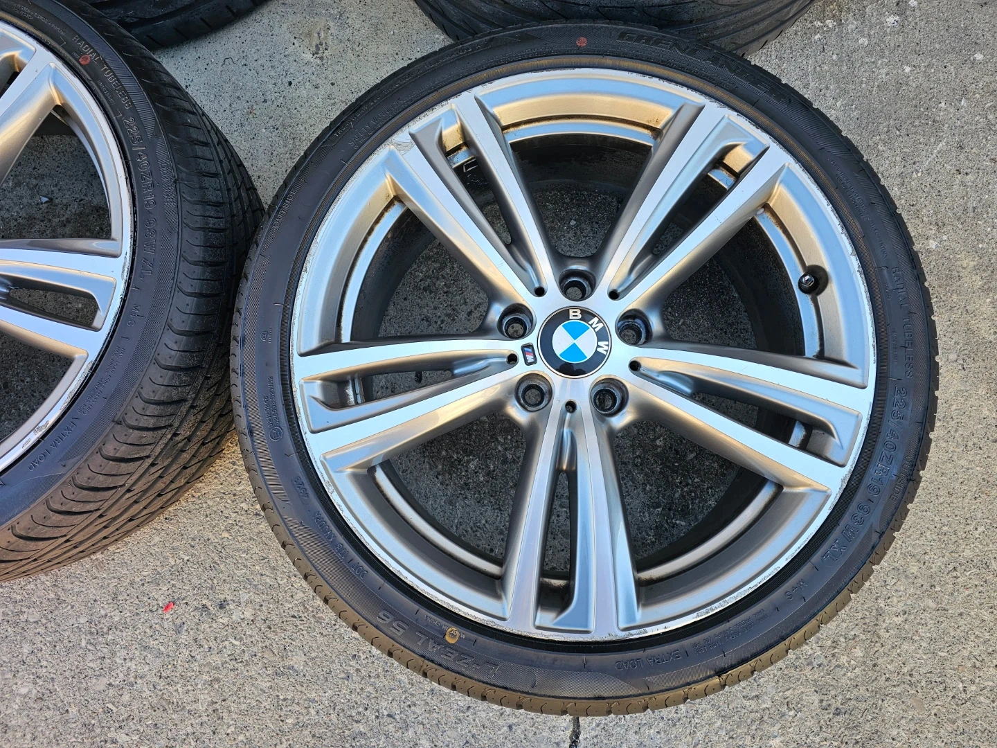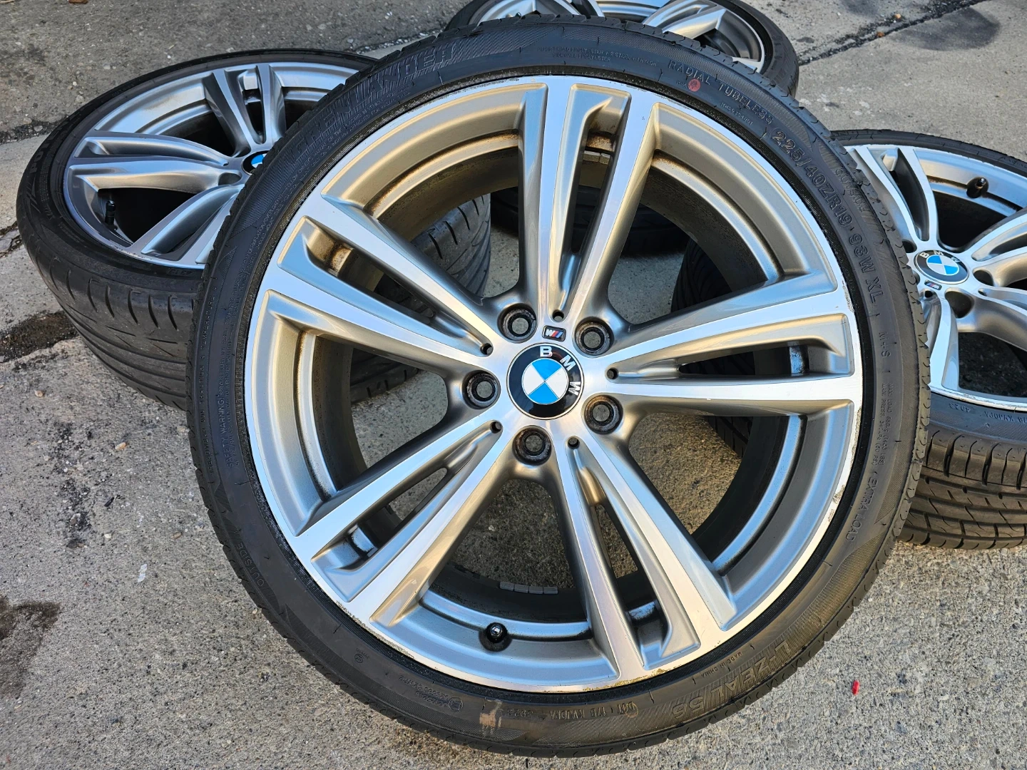 Set of 4 original 19" BMW 3, 4 series (m-sport) rims and all season tires on them. Rims and tires are in good shape, no damage, no bend, no cracks. Wheels are staggered set up