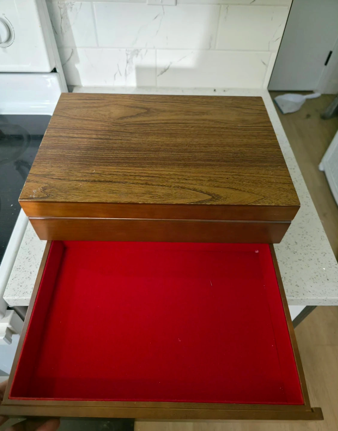 Selling a lovely wooden jewelry box! It features a rich, red velvet interior perfect for keeping your treasures safe and organized. The box has a classic design that would look great on any dresser or vanity. It's in great condition and ready for a new home!