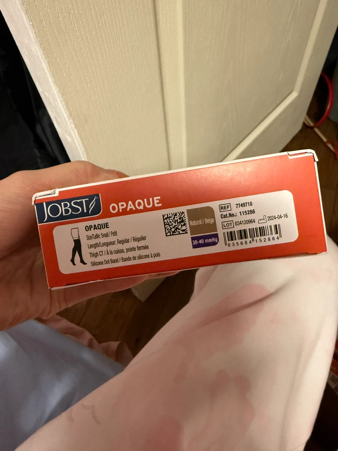 Selling a pair of Jobst Opaque compression stockings. They are size small, regular length, and in natural/beige colour. These are thigh-high stockings with a silicone band.