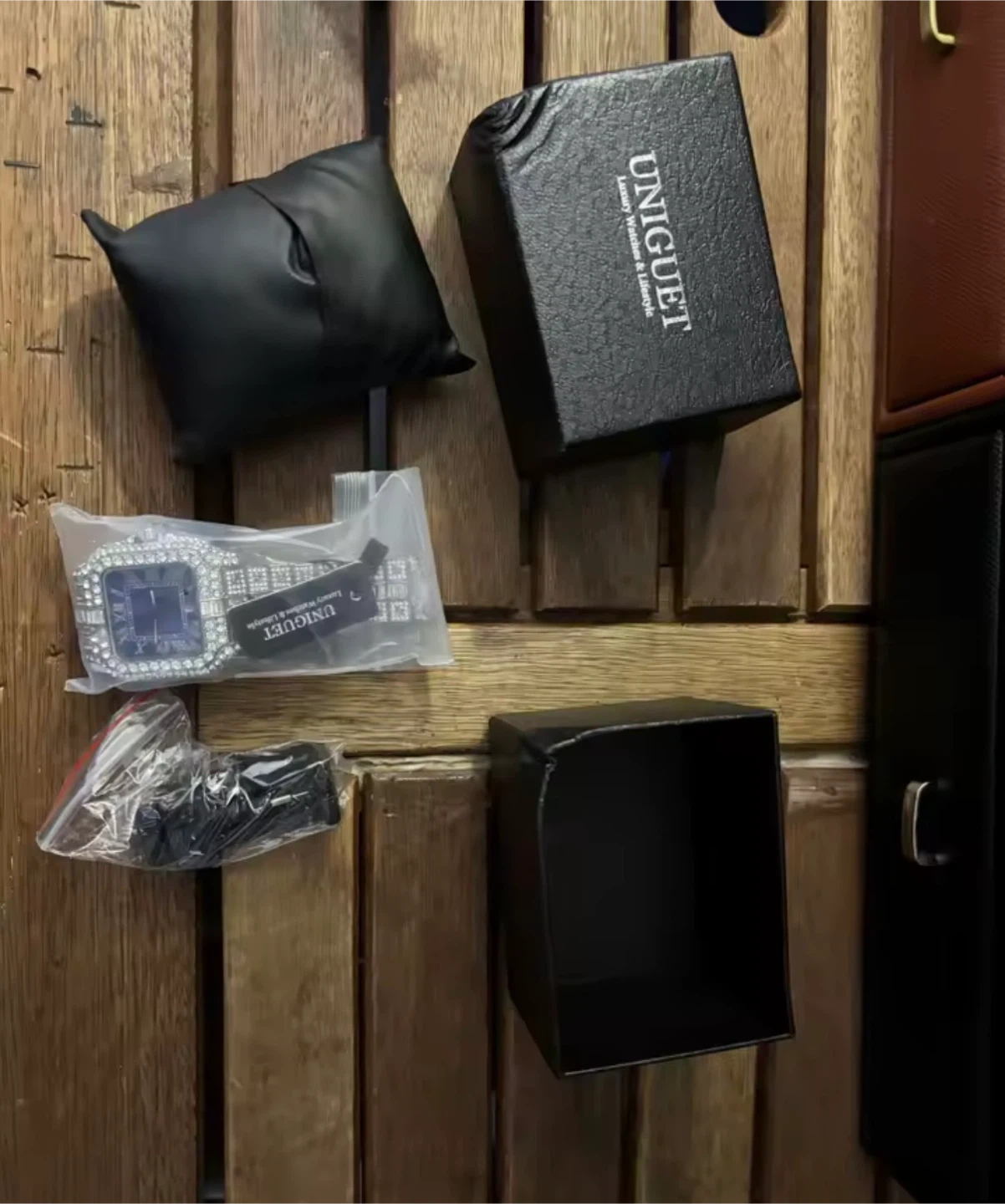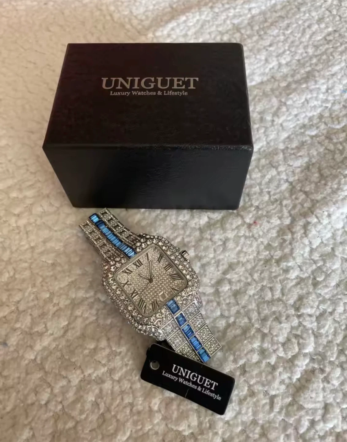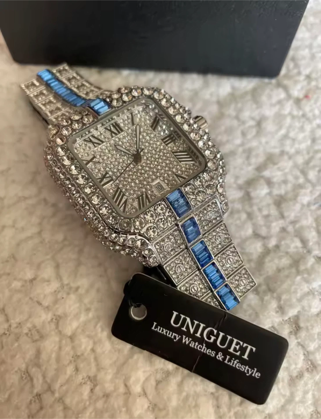 This Uniguet watch features a square face with Roman numerals and a date display. It's fully encrusted with sparkling stones. It comes with its original box and packaging.