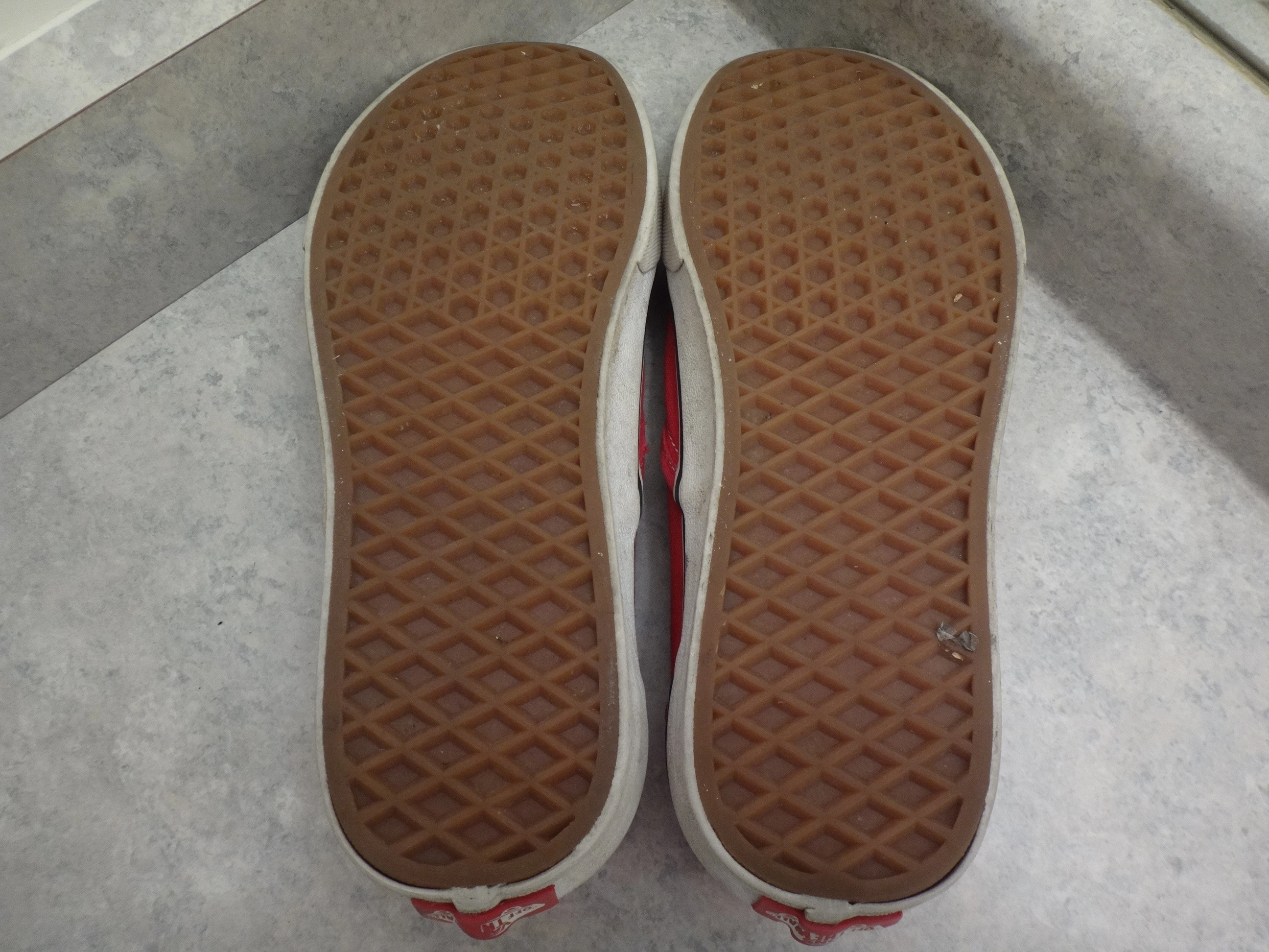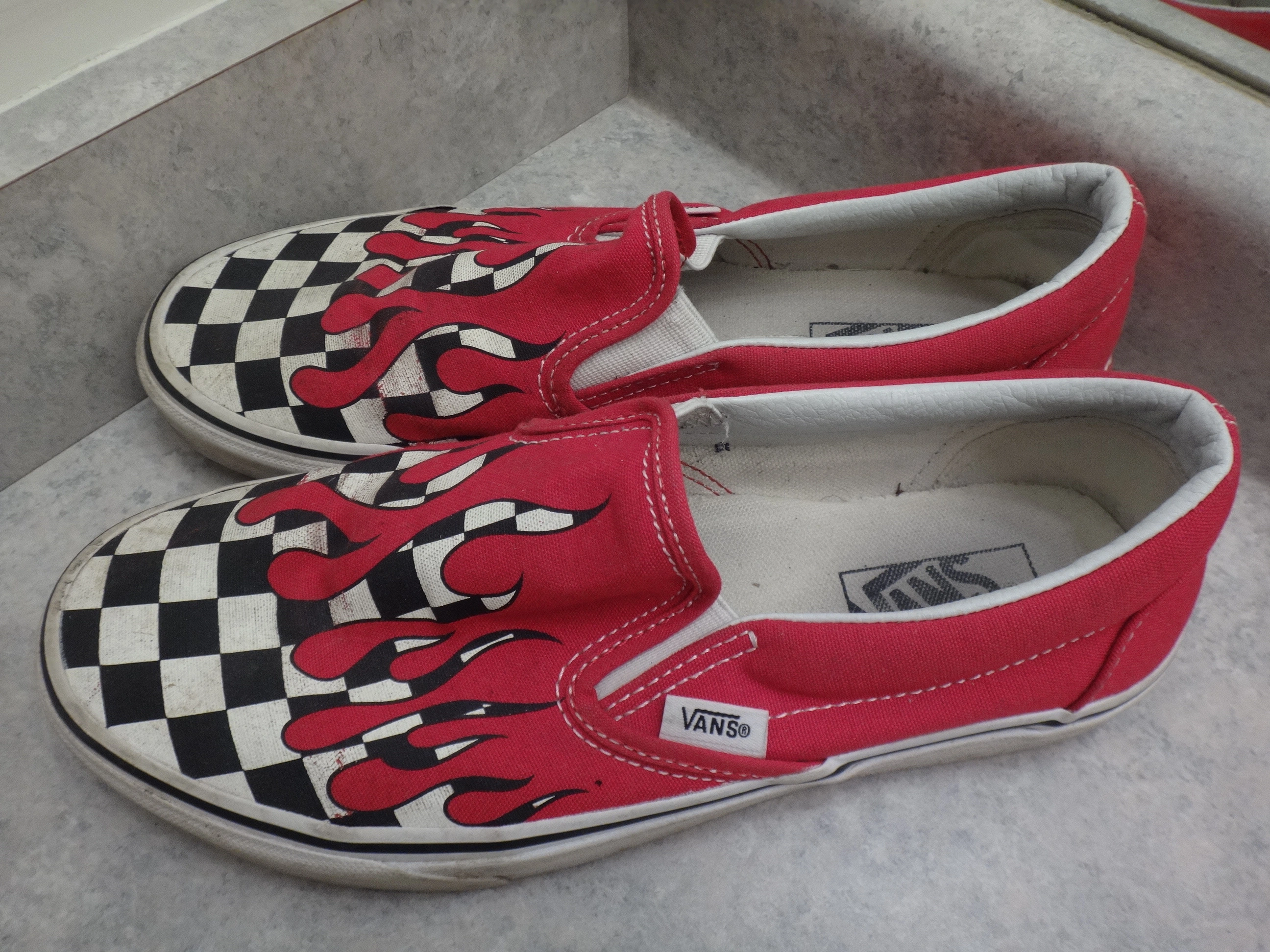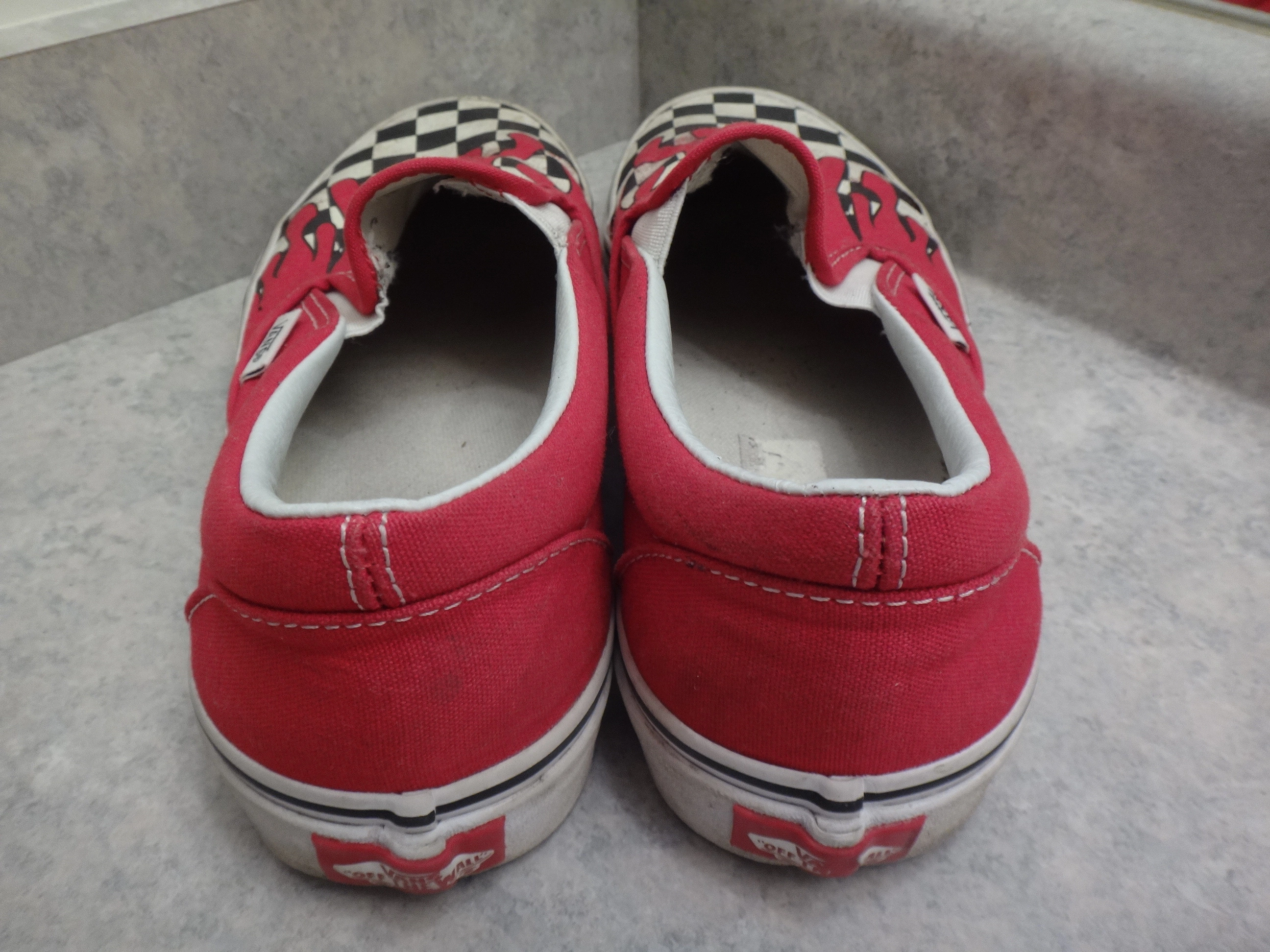 VANS Men's 7.5 / Women's 9 Classic Black and White Checkerboard and Red Flames Slip On Shoes Sneakers.