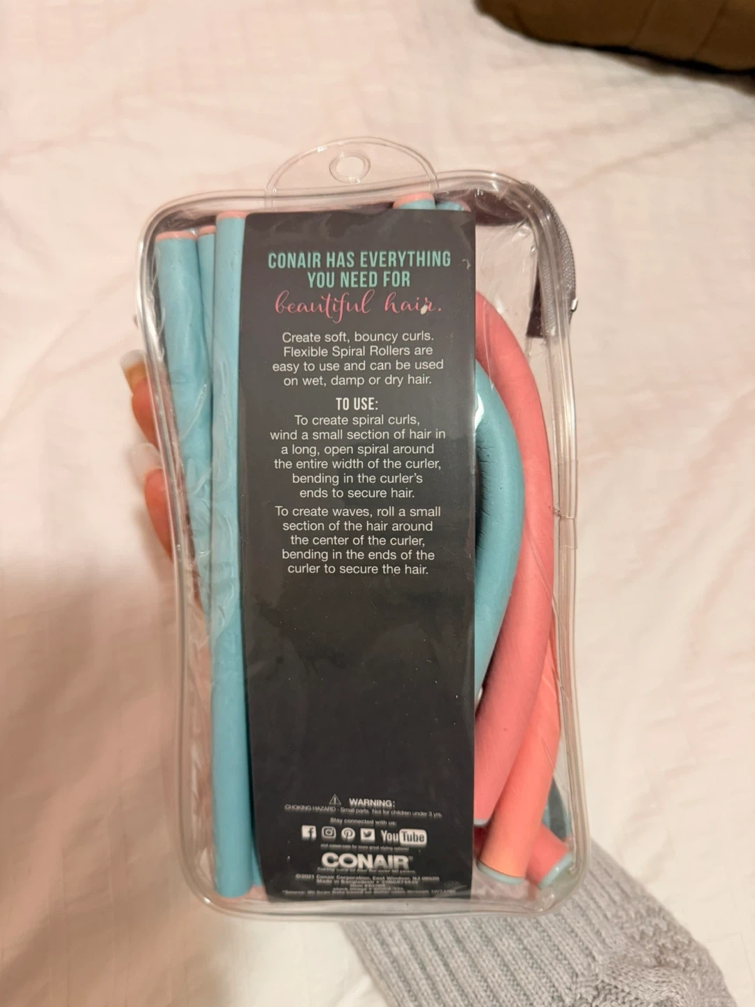Conair flexible spiral curlers make soft, bouncy curls. They're easy to use on wet, damp, or dry hair. Creates spiral curls and waves. Bending the ends secures the hair.