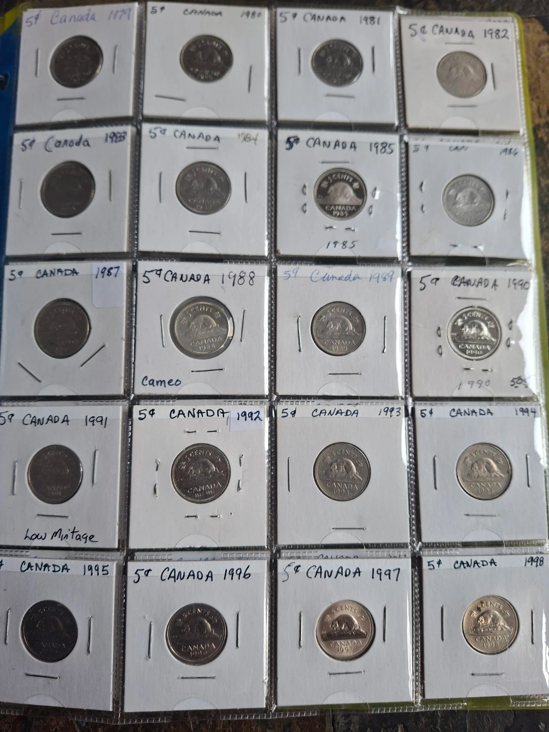 This collection includes 5-cent Canadian nickels from 1922 to 2025, with all years represented except 1925. It contains over 106 nickels in total. This is a great set for coin collectors! All coins are housed in protective sleeves.