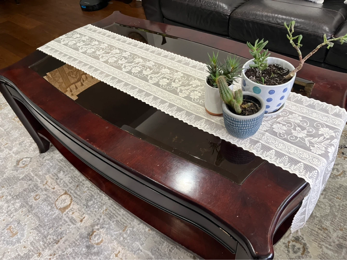 Dark wood coffee table featuring a glass inlay top and a lower shelf for storage. Its curved design adds a touch of elegance to any living space. This table is perfect for placing drinks, books, or decorative items.