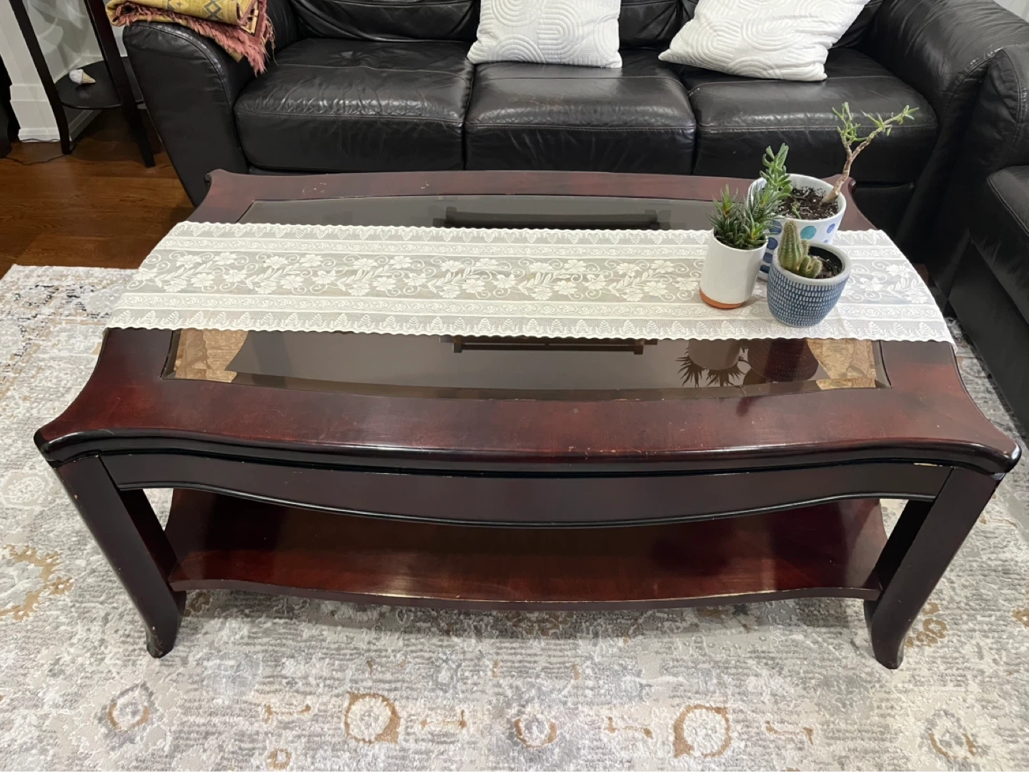 Dark wood coffee table featuring a glass inlay top and a lower shelf for storage. Its curved design adds a touch of elegance to any living space. This table is perfect for placing drinks, books, or decorative items.