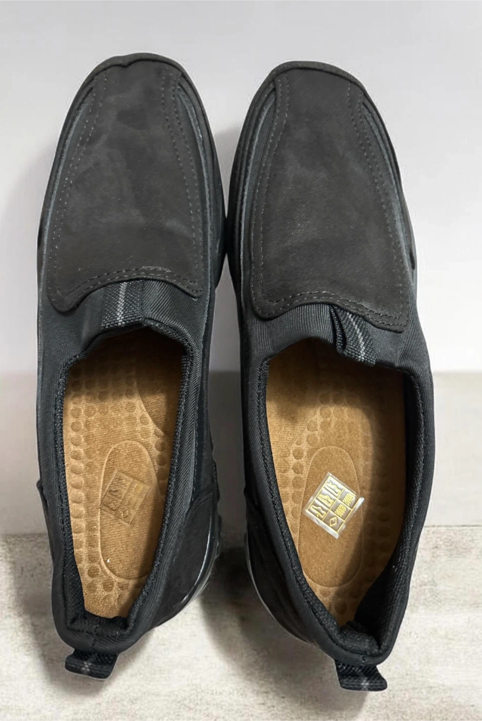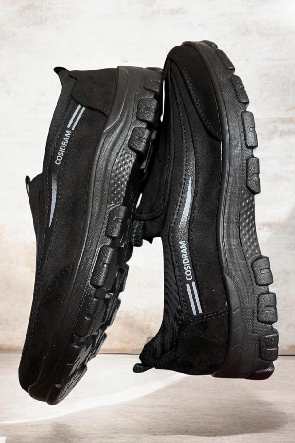 These black slip-on shoes by COSIDRAM are designed for comfort. They feature a durable outsole with good tread for traction. The size indicated on the sole is 275.