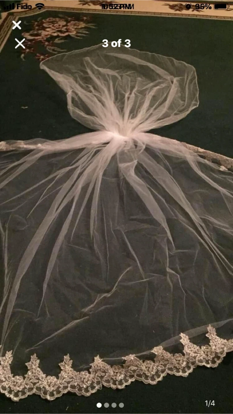 This is a beautiful white wedding veil. It features delicate lace trim along the edges. Perfect for your special day!