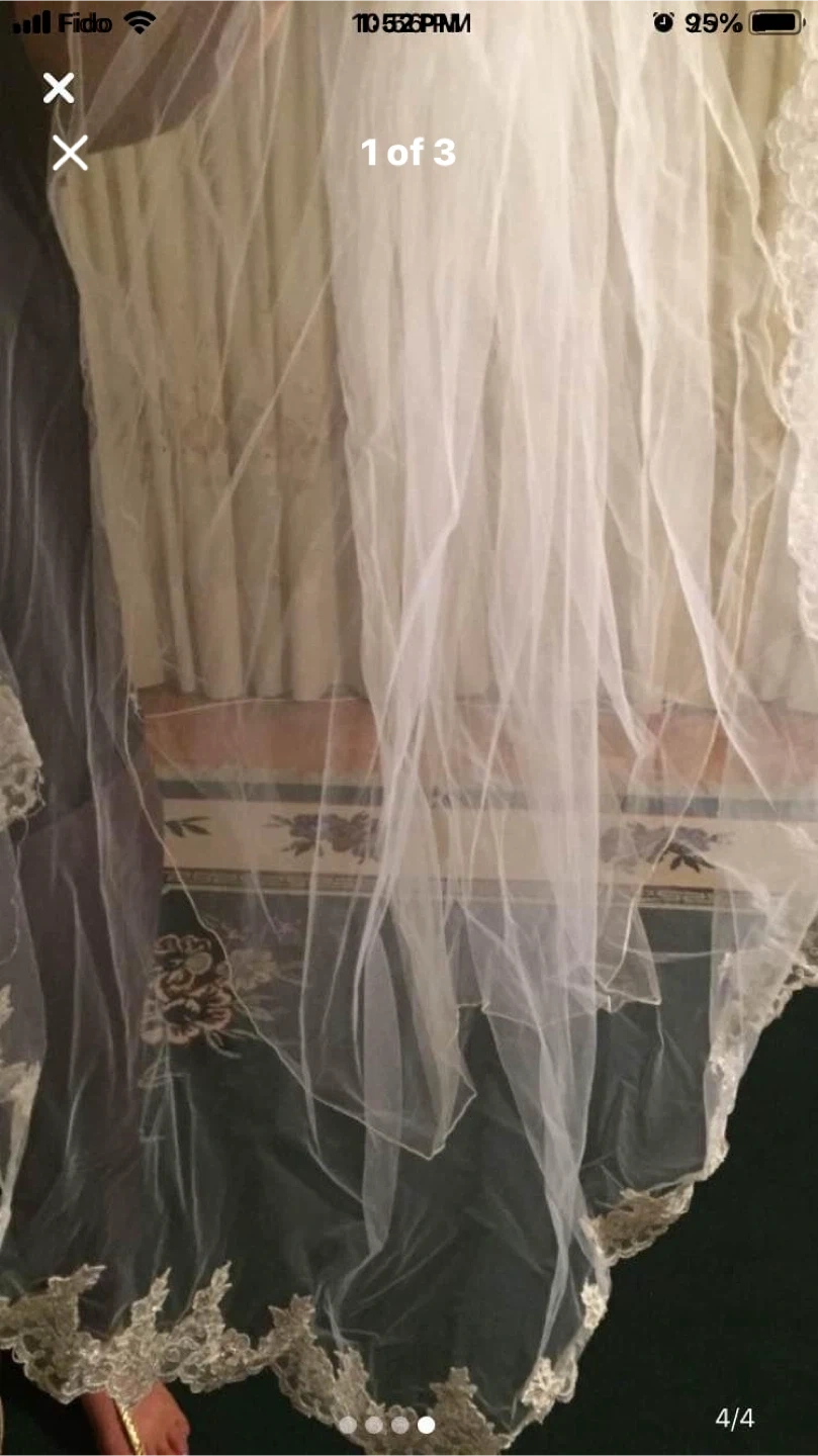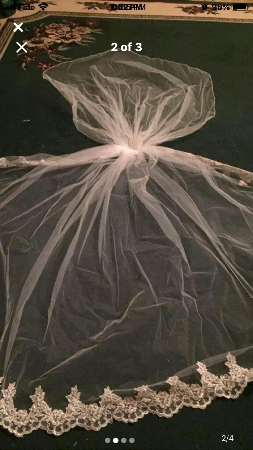 This is a beautiful white wedding veil. It features delicate lace trim along the edges. Perfect for your special day!