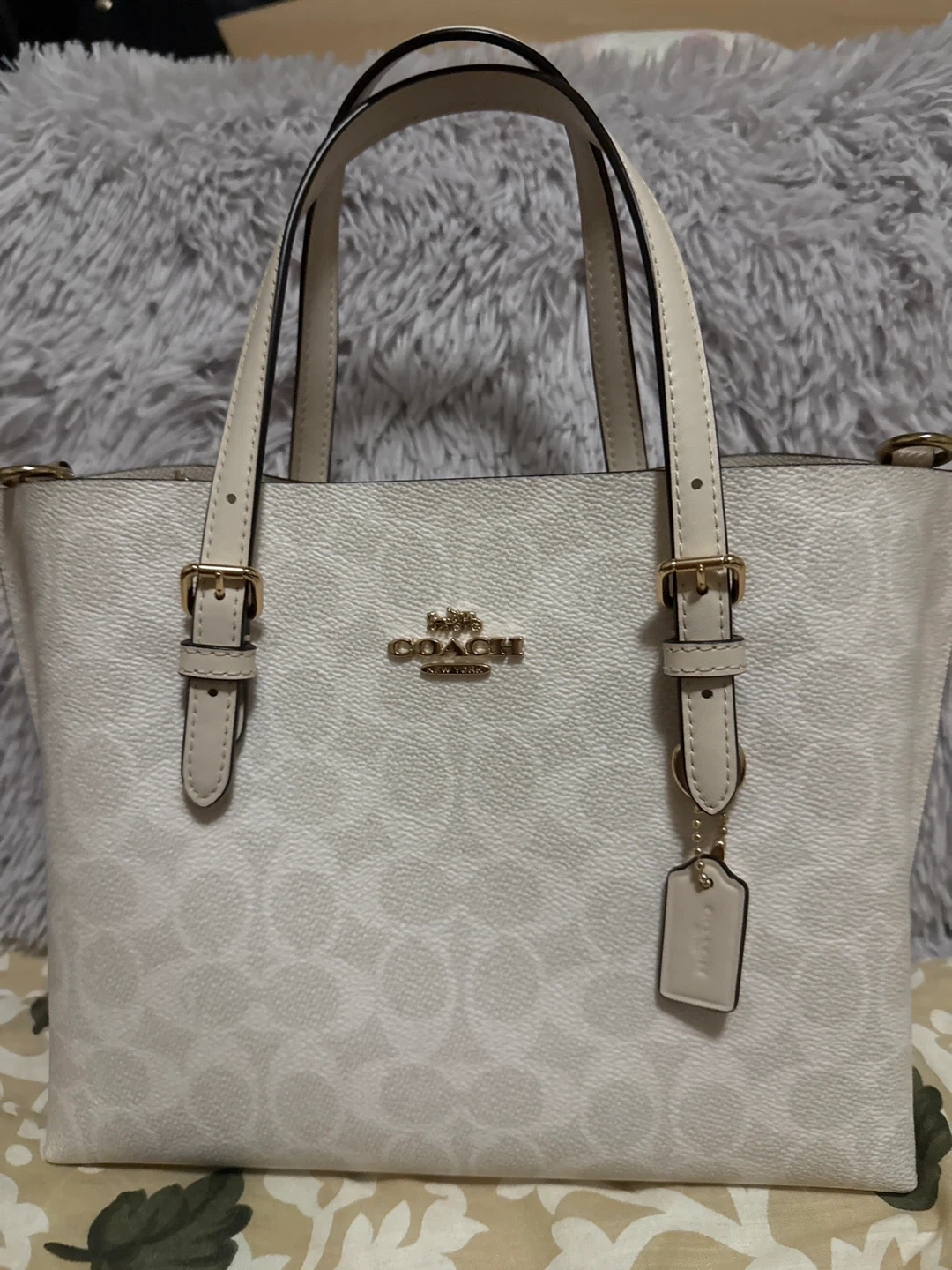 Selling a Coach Small Town Bucket Bag in ivory. It's in great condition and perfect for everyday use! The bag features the Coach logo and a cute little tag.