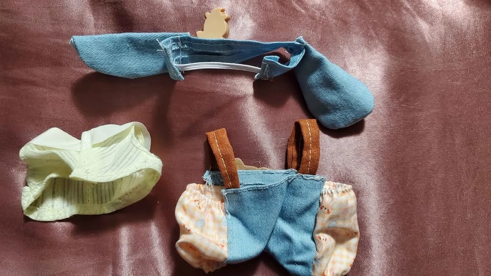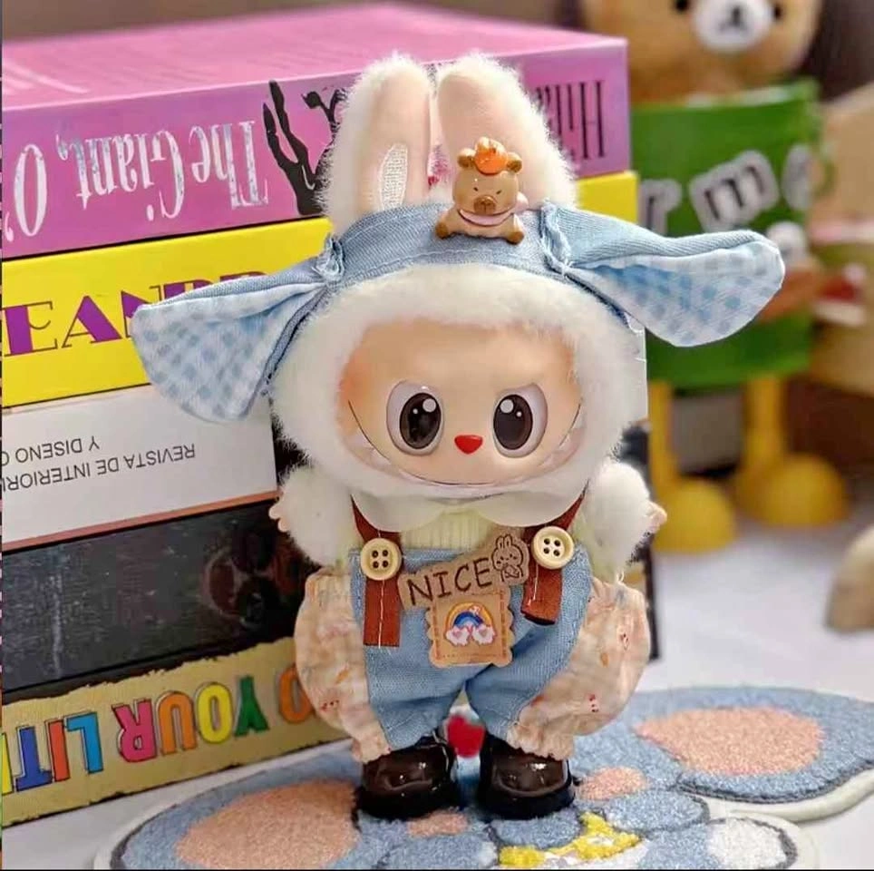 3 Pieces Adorable Autumn Labubu outfit set – includes a cute gingham headband, yellow top with peter pan collar, and denim-style overalls with “NICE” patch and button straps. Perfect for giving your Labubu a sweet, vintage-inspired look! 🧸