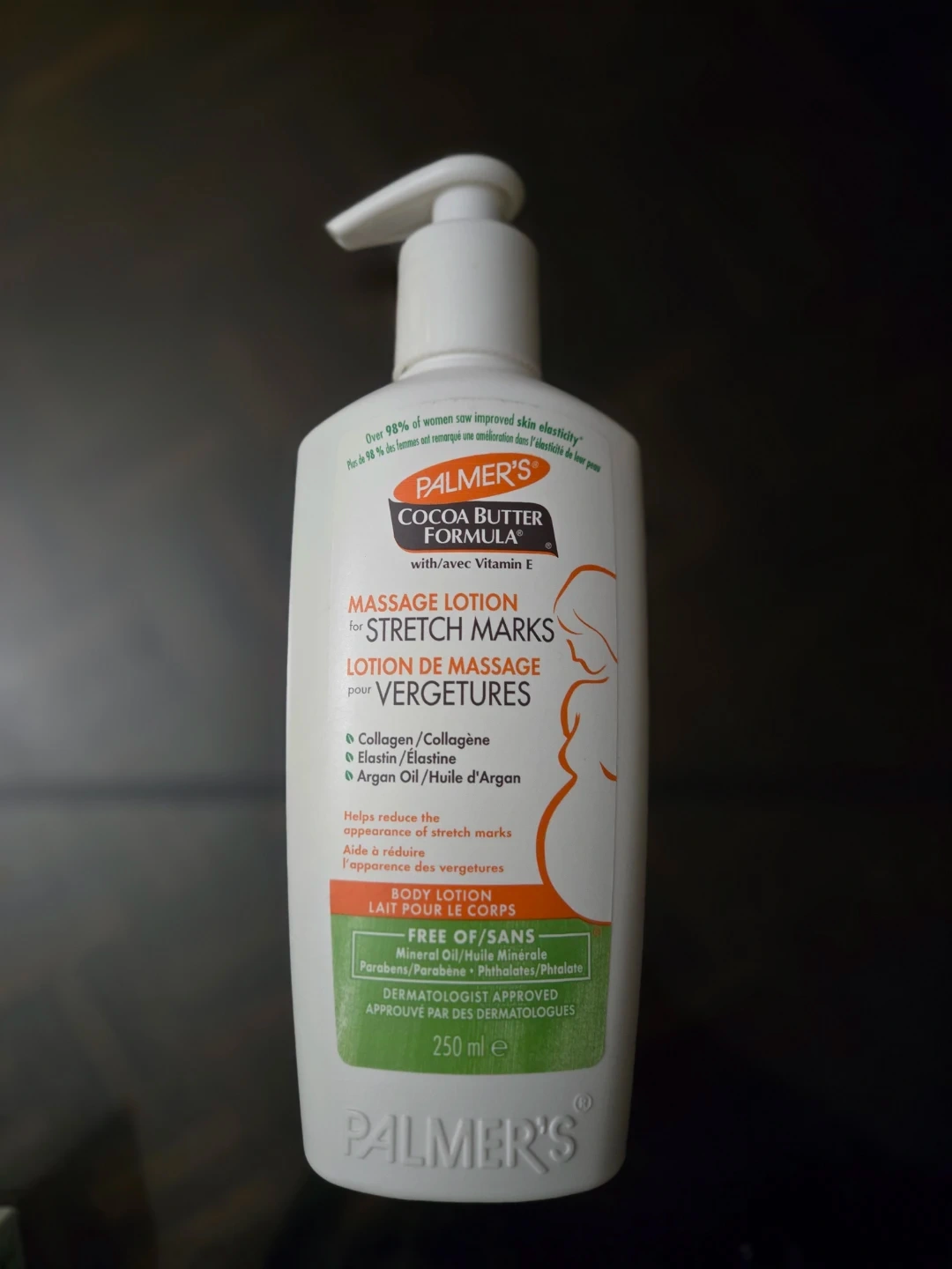 Palmer's Cocoa Butter Formula Massage Lotion helps improve skin elasticity and reduce the appearance of stretch marks. It contains collagen, elastin, and argan oil to help reduce the appearance of stretch marks. It's also free of mineral oil, parabens, and phthalates, and is dermatologist approved. The bottle contains 250 ml of body lotion.