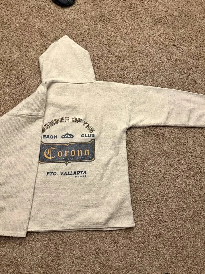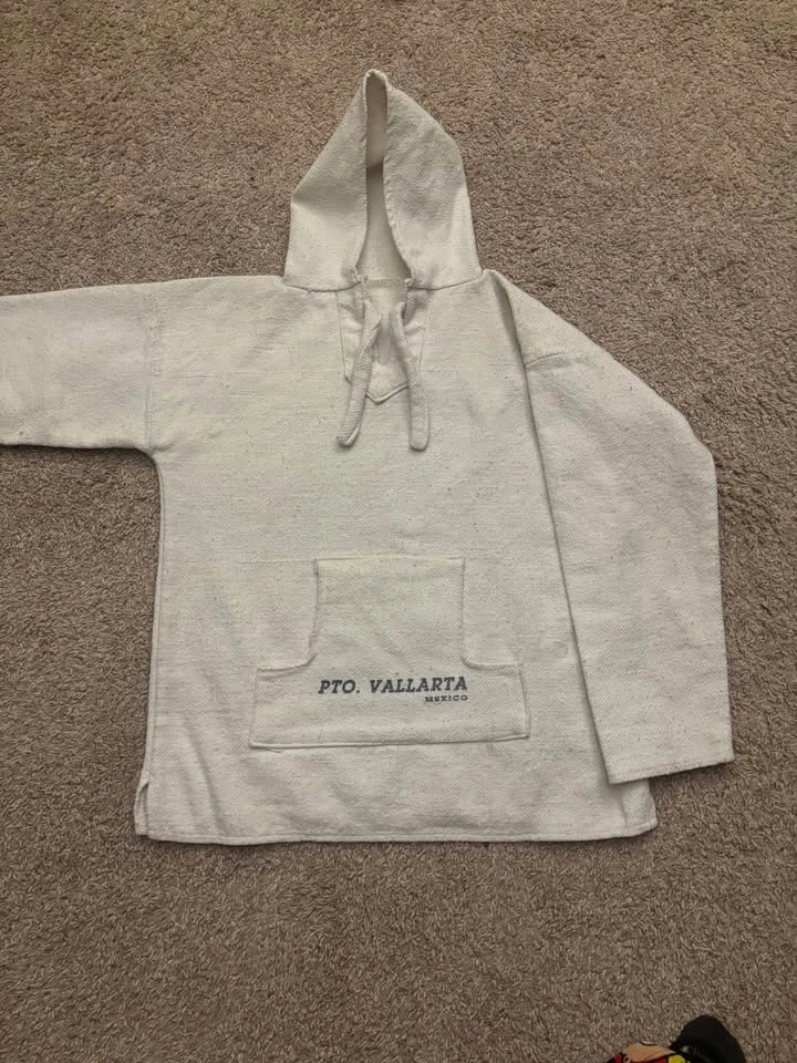 Get that classic vacation look with this authentic white knit "drug rug" pullover. This piece features bold screen-printed graphics celebrating Pto. Vallarta, Mexico. It’s a heavy, textured knit that is perfect for beach bonfires, cool summer nights, or festival wear.