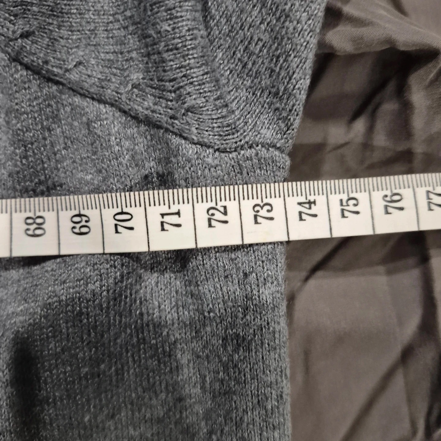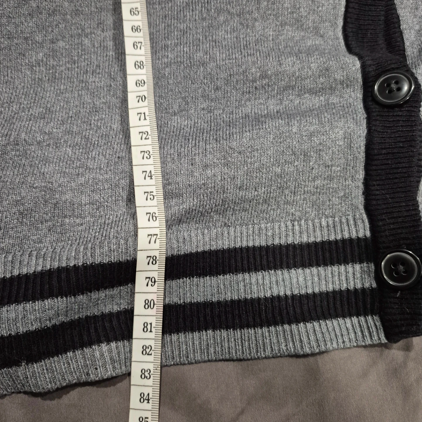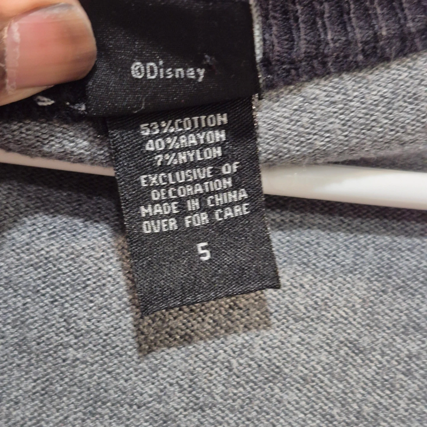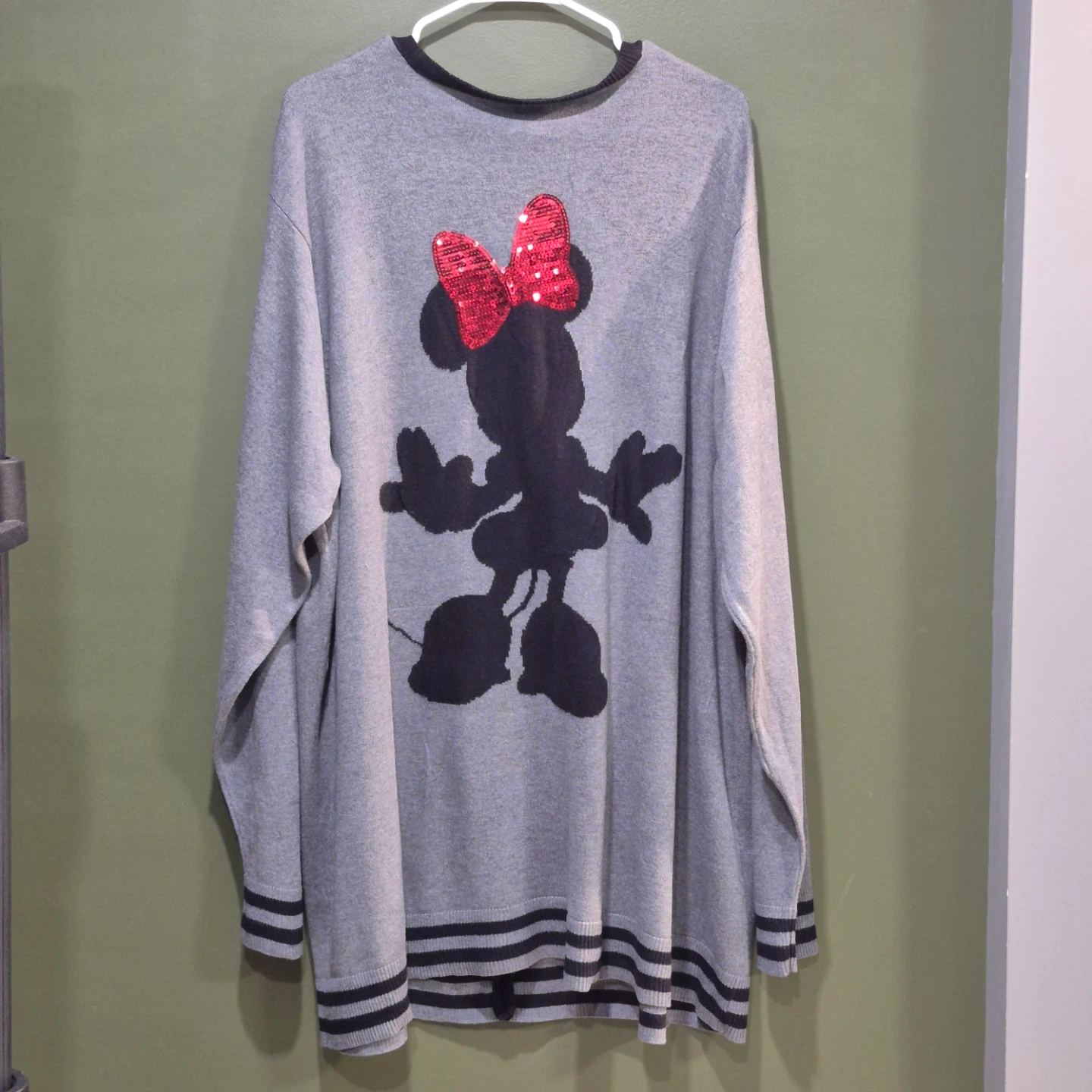 Grey Disney cardigan featuring Minnie Mouse with red sequin bow. It's made of a cotton, rayon, and nylon blend. Button-up front with dark trim. This would be fun for any Disney fan!
