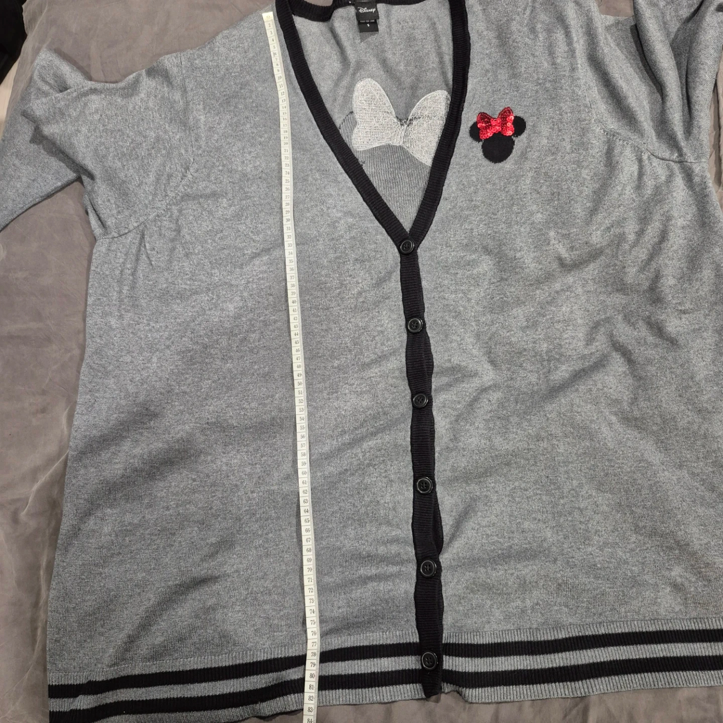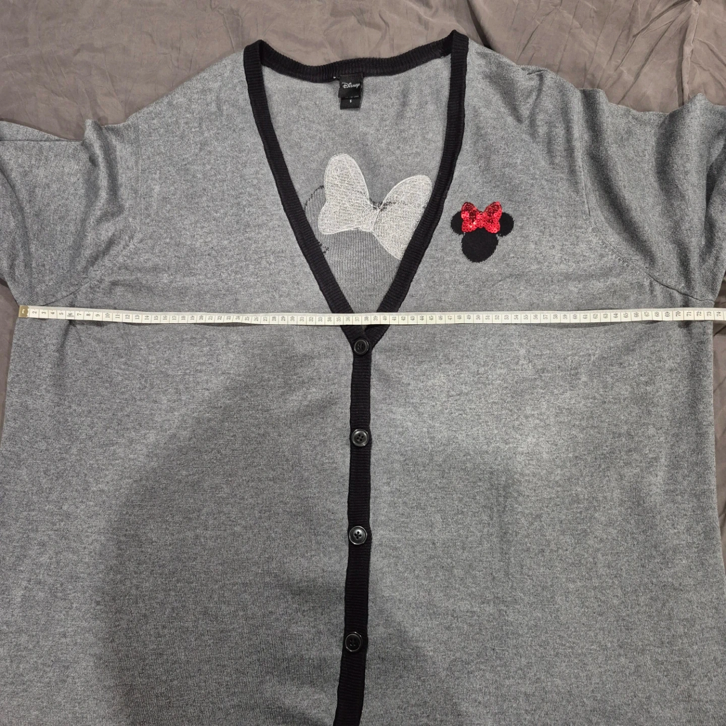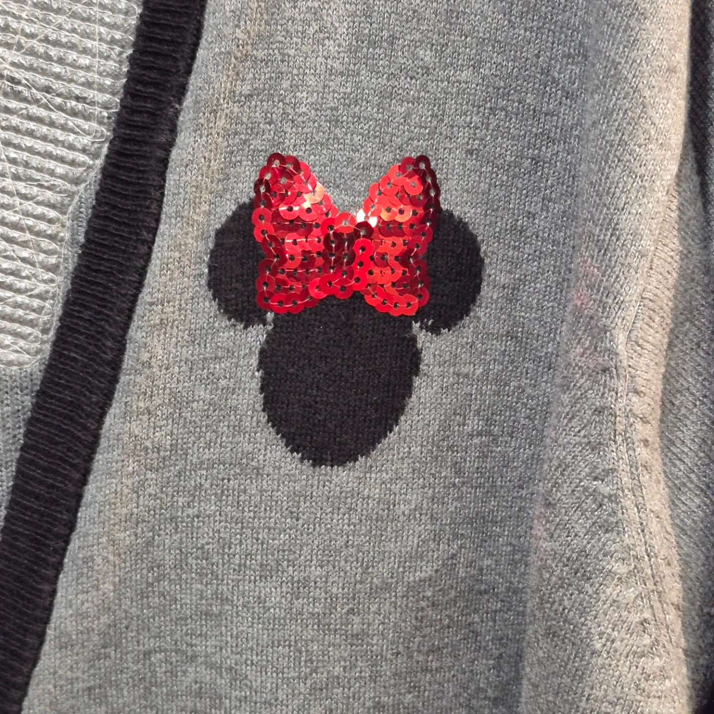 Grey Disney cardigan featuring Minnie Mouse with red sequin bow. It's made of a cotton, rayon, and nylon blend. Button-up front with dark trim. This would be fun for any Disney fan!