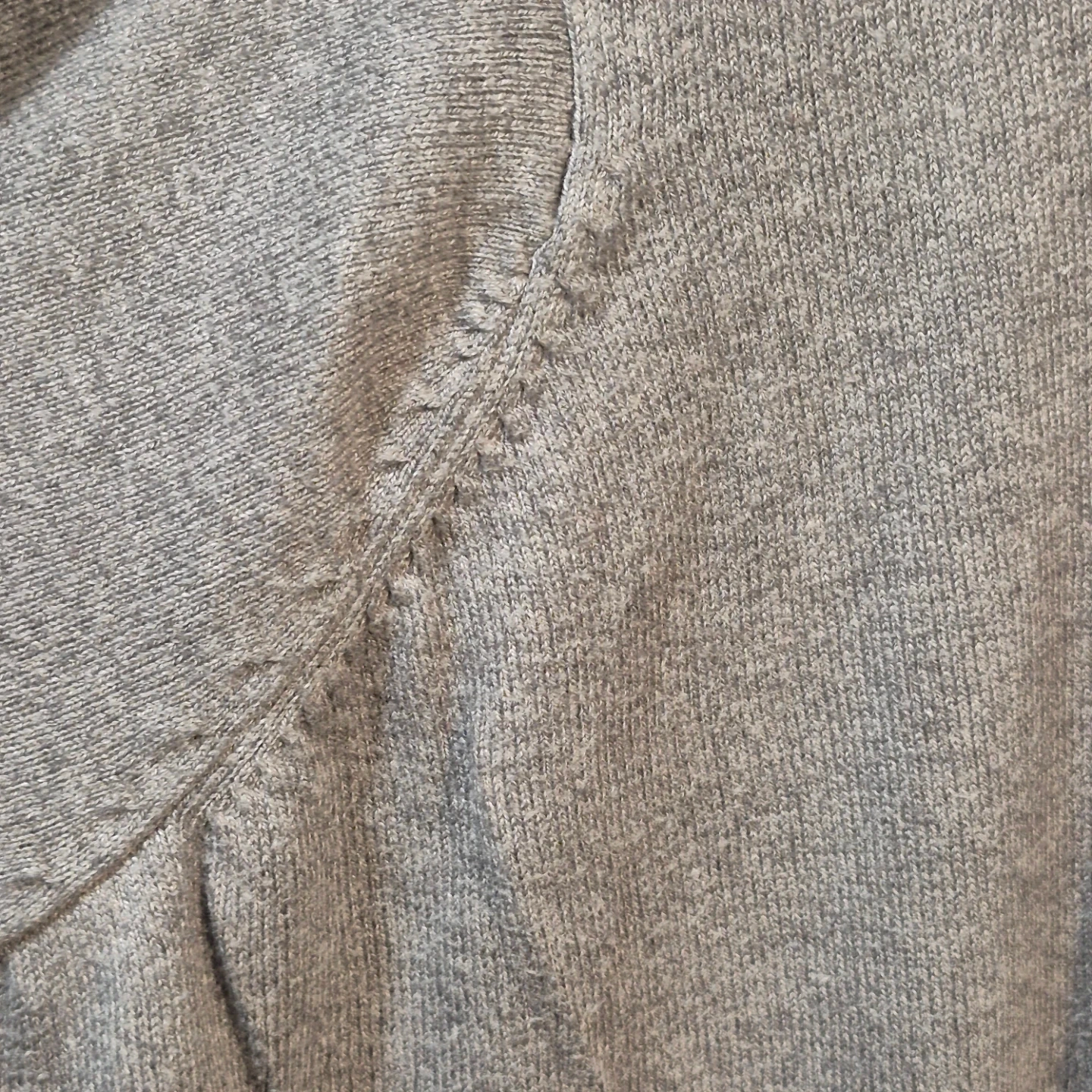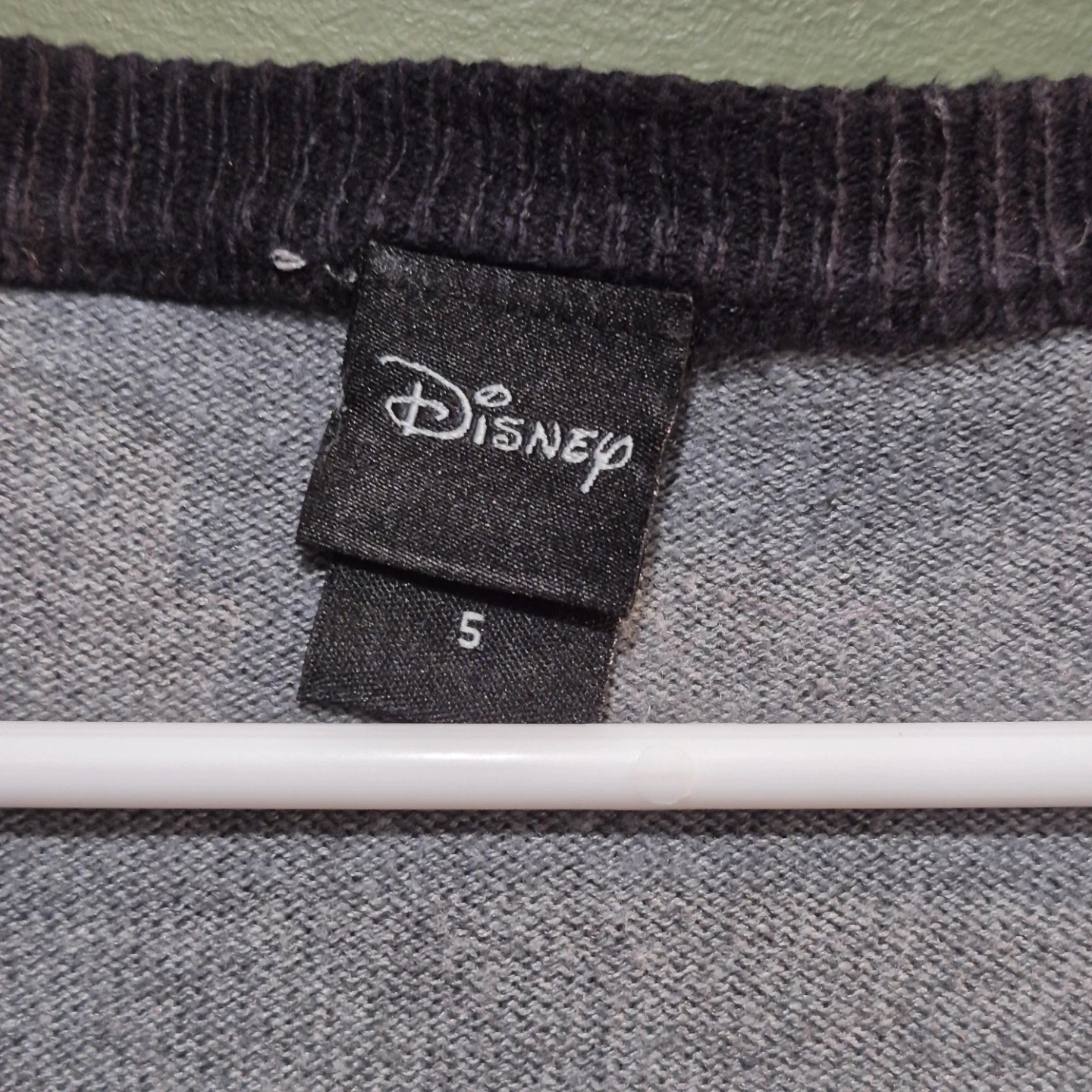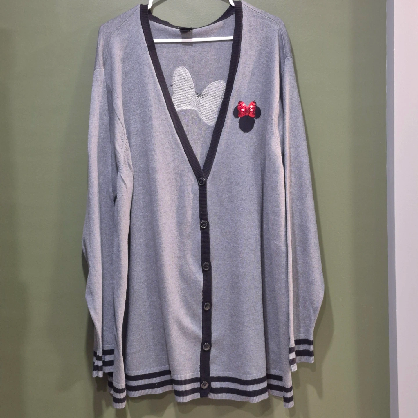 Grey Disney cardigan featuring Minnie Mouse with red sequin bow. It's made of a cotton, rayon, and nylon blend. Button-up front with dark trim. This would be fun for any Disney fan!