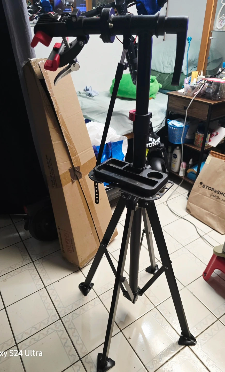 Foldable Bike Repair Stand with Quick Release Telescopic Arm.