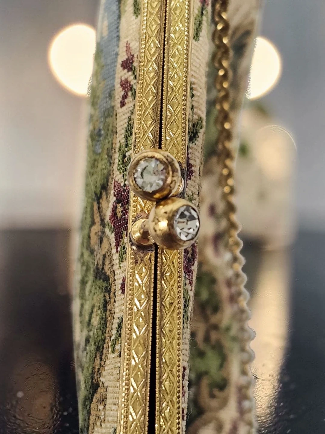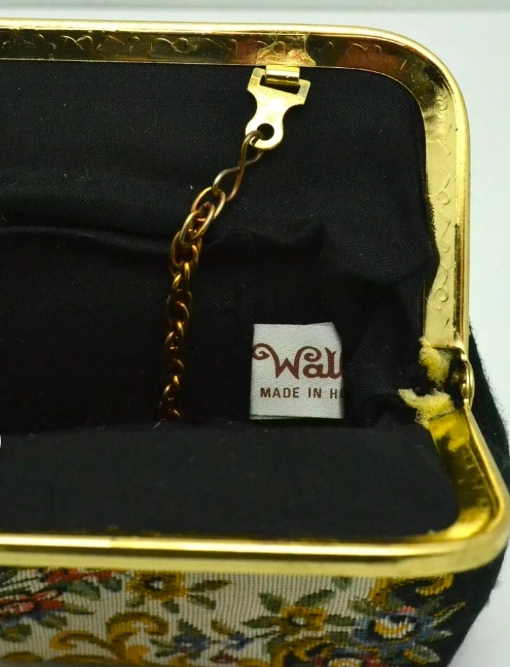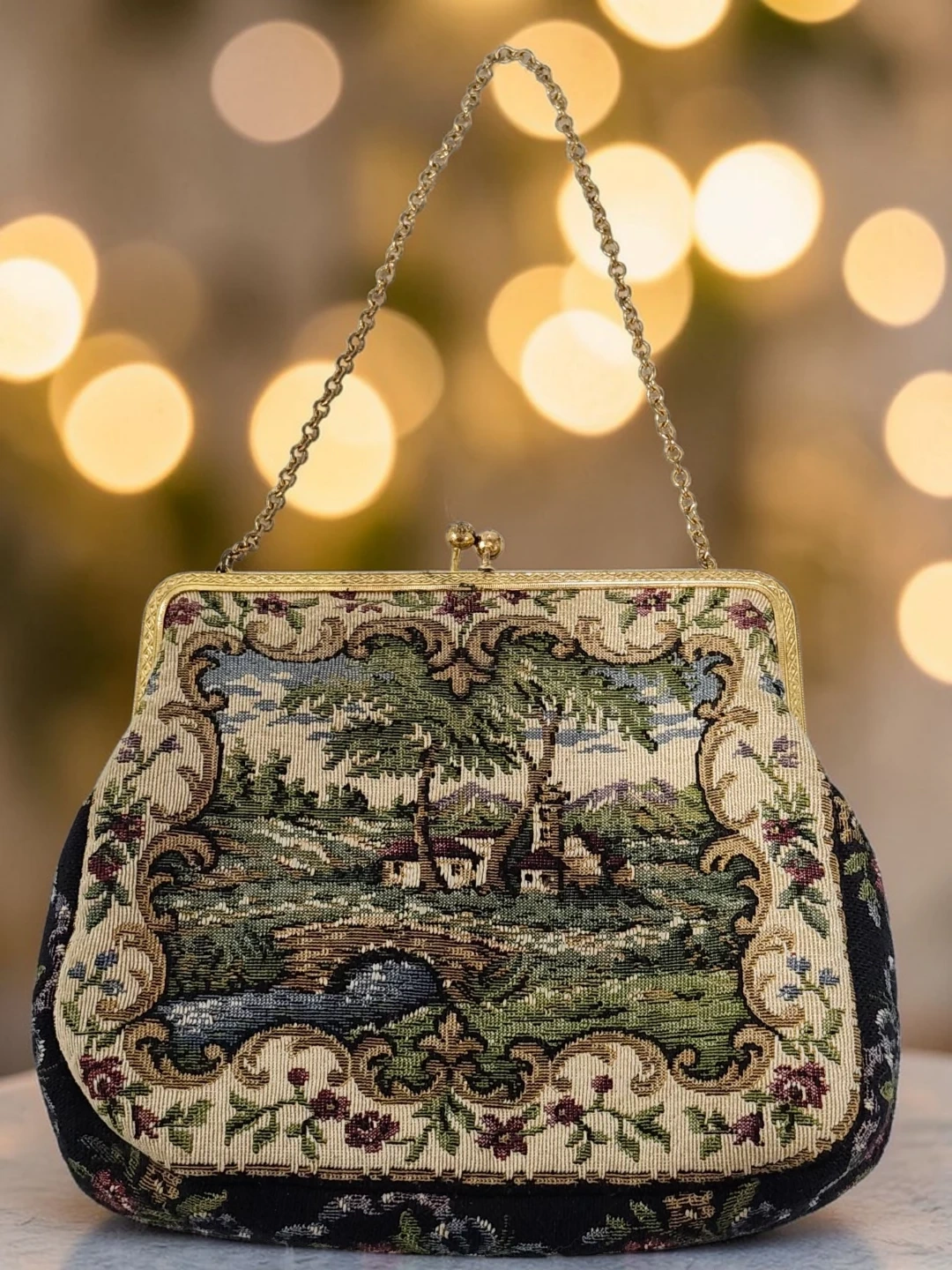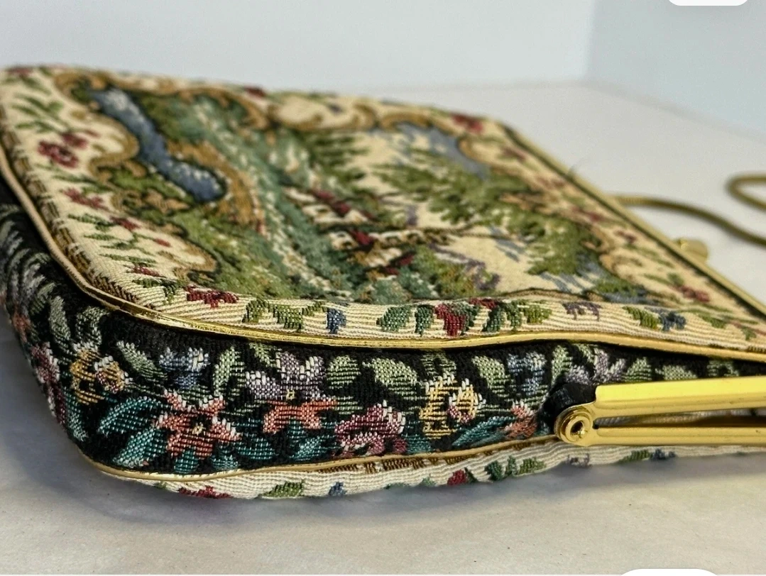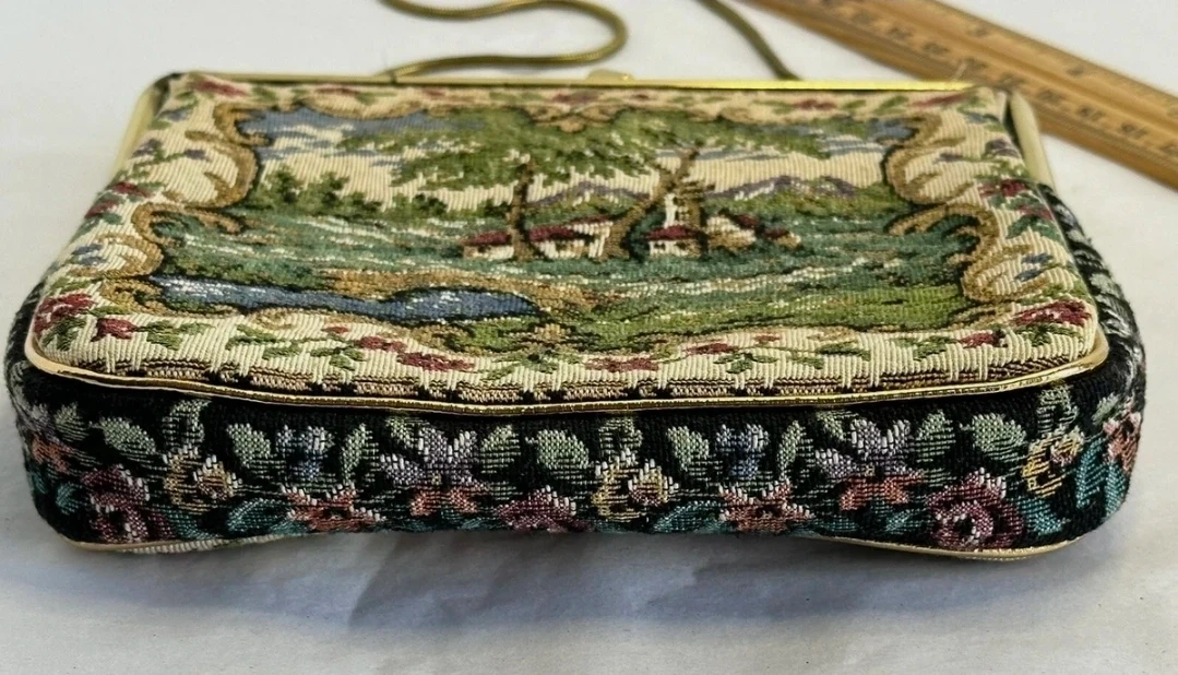 This vintage coin purse features a beautiful tapestry scene with a landscape, houses, and a bridge. It has a gold-tone chain strap and a decorative clasp with rhinestones. The sides are black with a floral embroidered pattern.