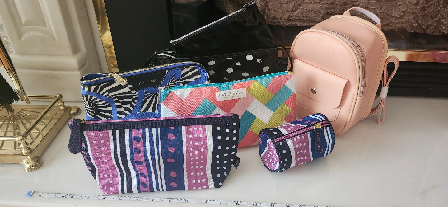 A collection of cosmetic bags from Estee Lauder, Clinique and Lancome with bonuses. The set features a small pink plastic backpack, great for toiletries! One of the Estee Lauder cosmetics bag comes with a bonus pouch, as is the black dotted bag from Lancome! Never been used.