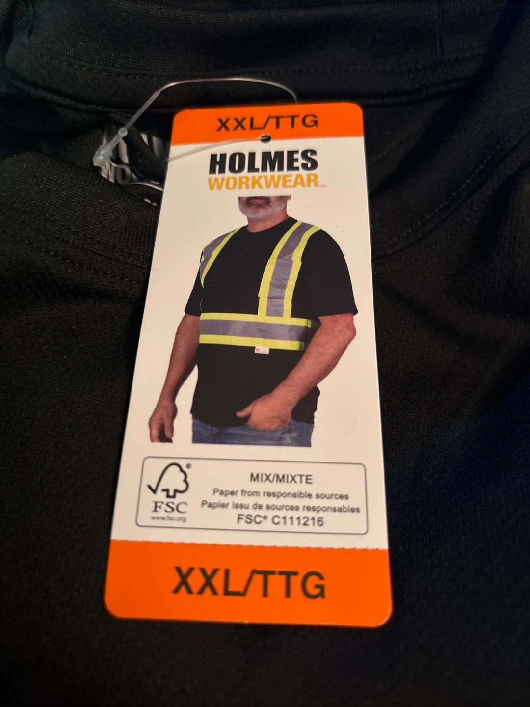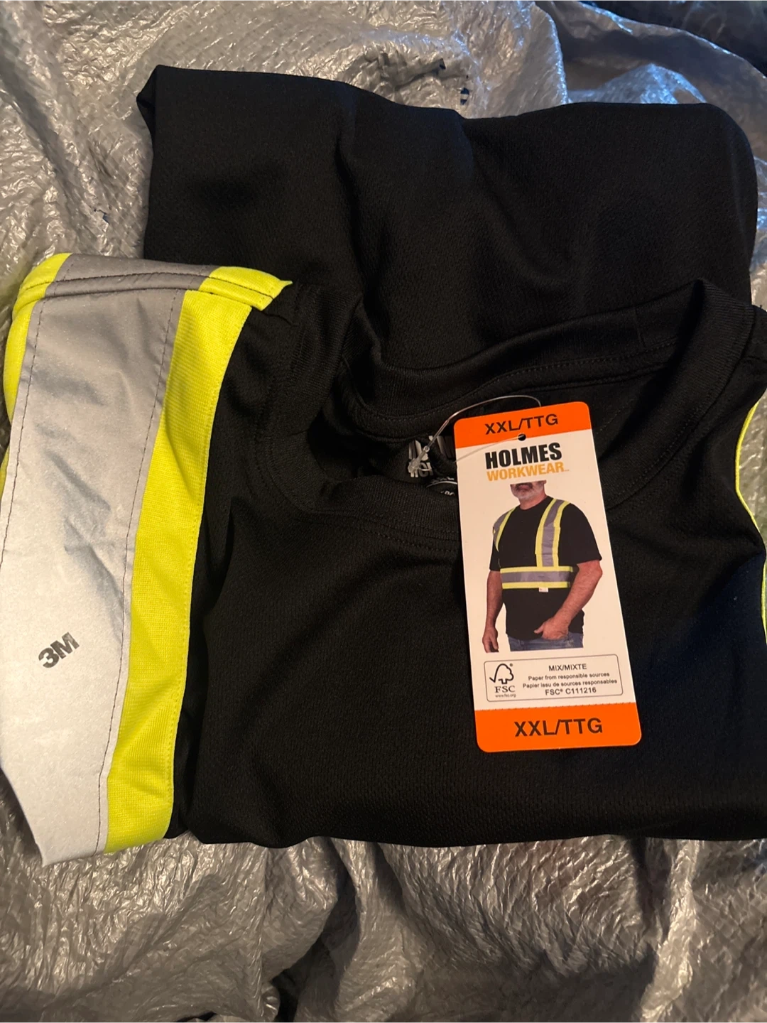 I'm selling a brand new Holmes Workwear safety t-shirt. It's black with reflective stripes and is size XXL/TTG. Perfect for work!