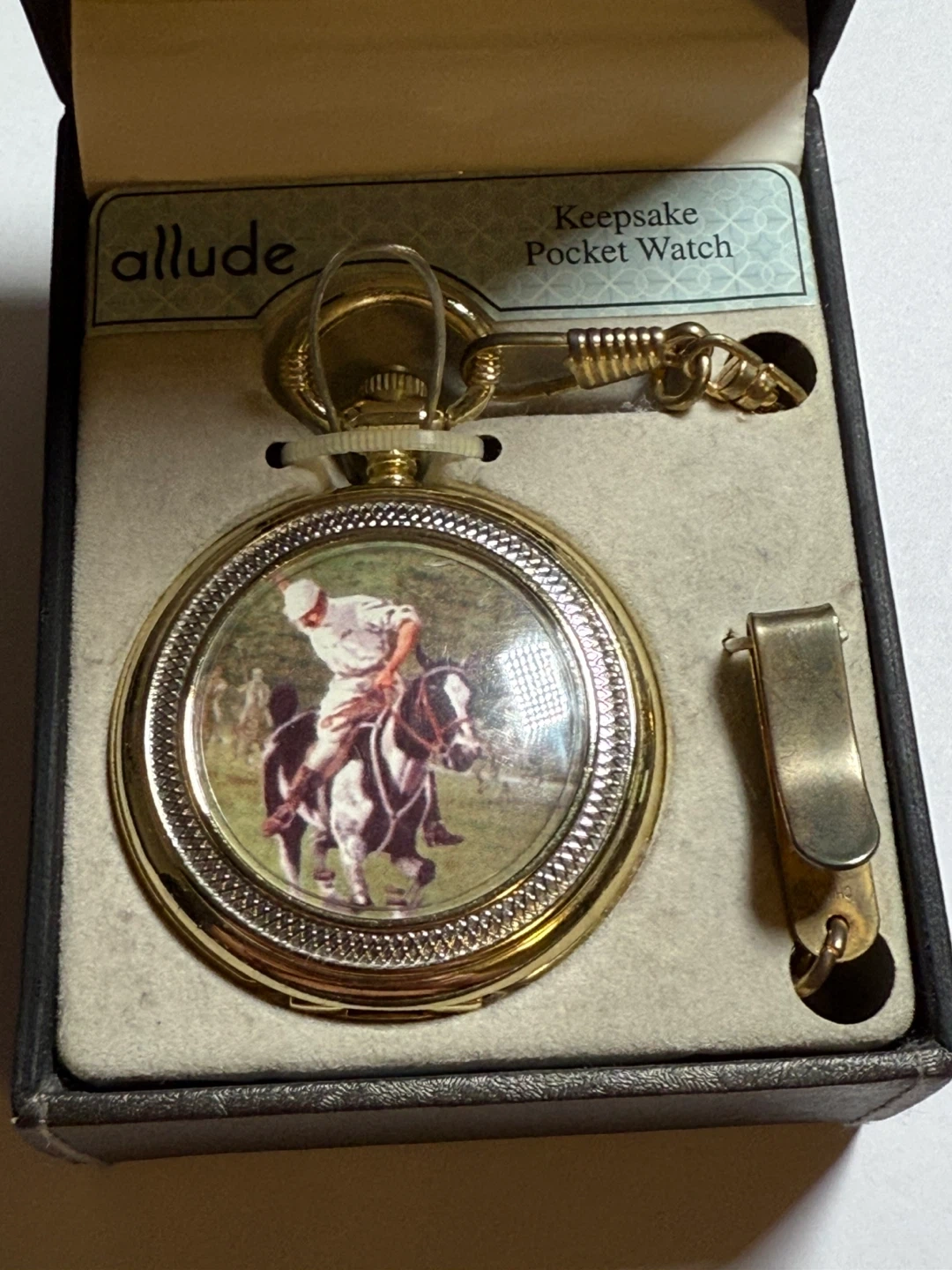 This Allude keepsake pocket watch features a vibrant polo scene on the dial. It includes a gold-tone chain and a clip for easy attachment. This watch would make a thoughtful gift for any collector.