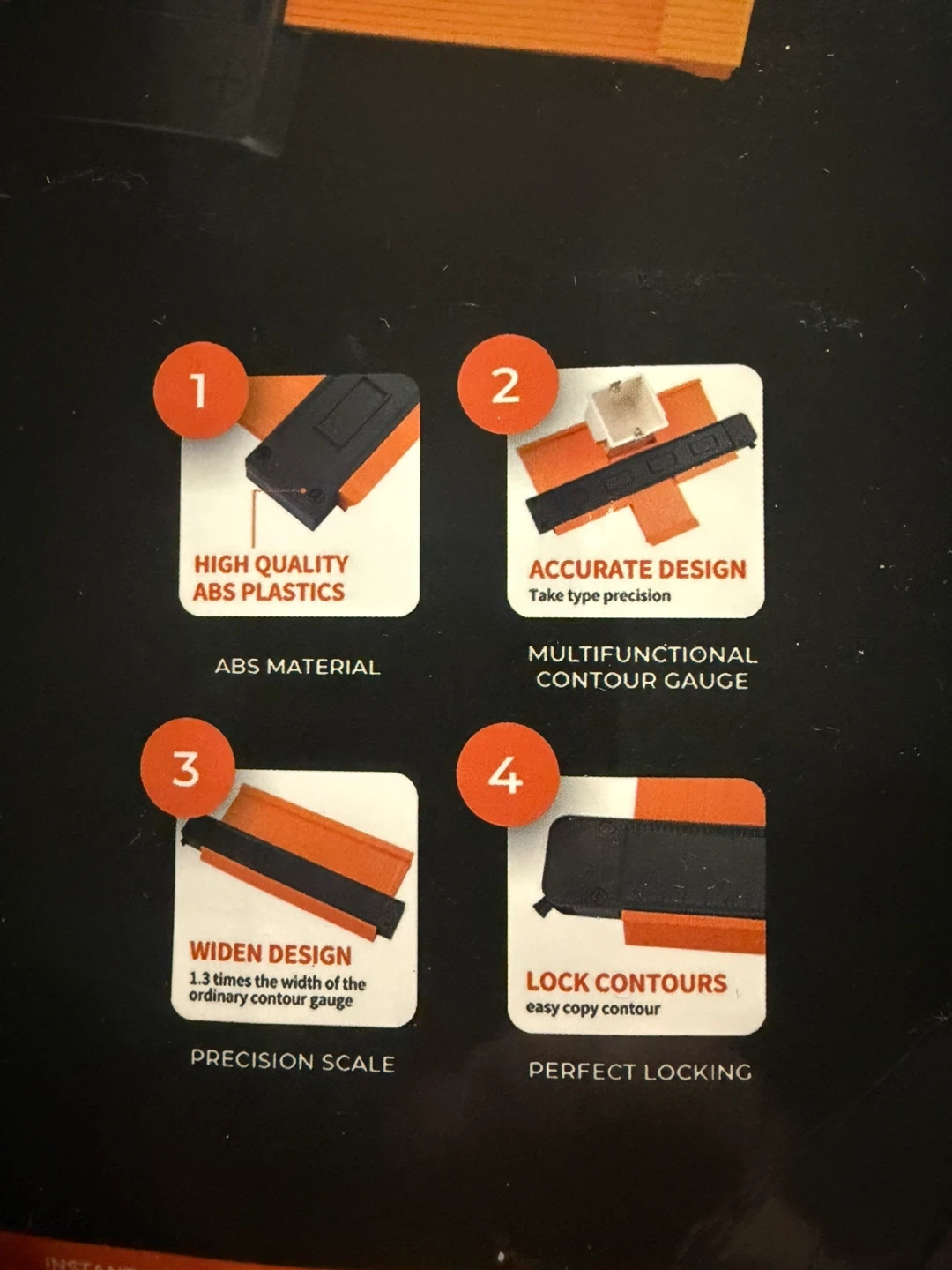 This contour gauge duplicates any shape accurately. It's made from ABS plastics and features a precision scale. The widen design is 1.3 times the width of an ordinary contour gauge. Perfect for woodworking and tile cutting!