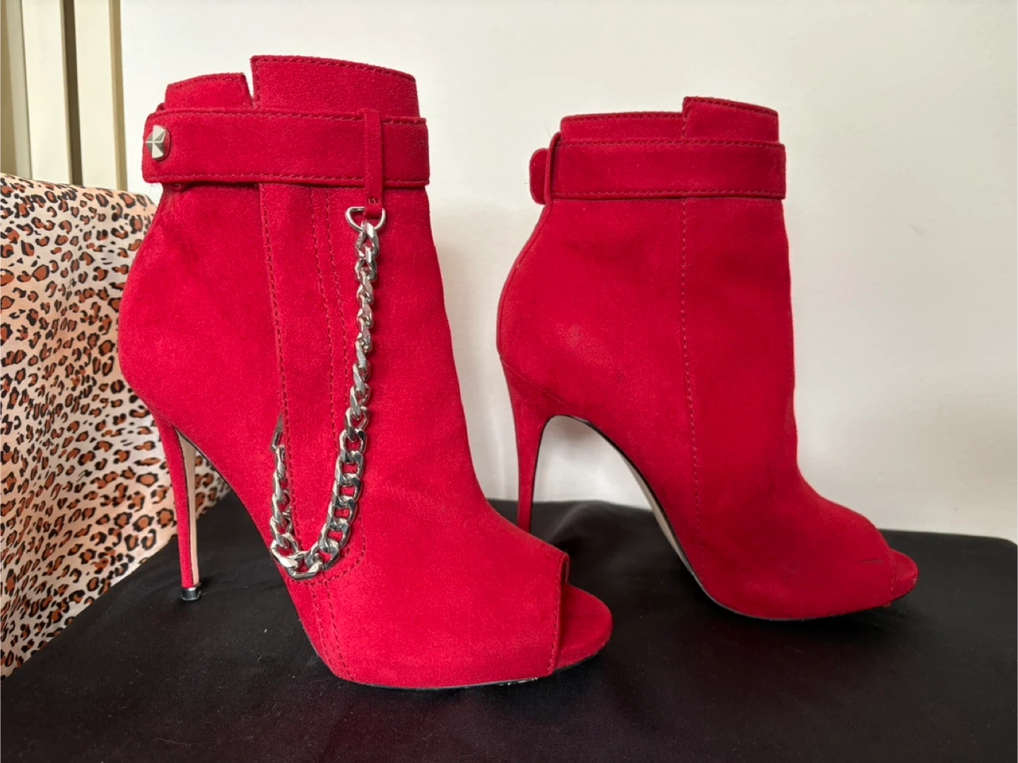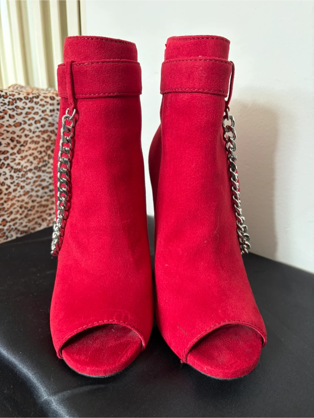 These bright red peep-toe ankle boots are sure to make a statement! They feature a stylish chain detail and a comfortable heel height. Perfect for adding a pop of colour to any outfit