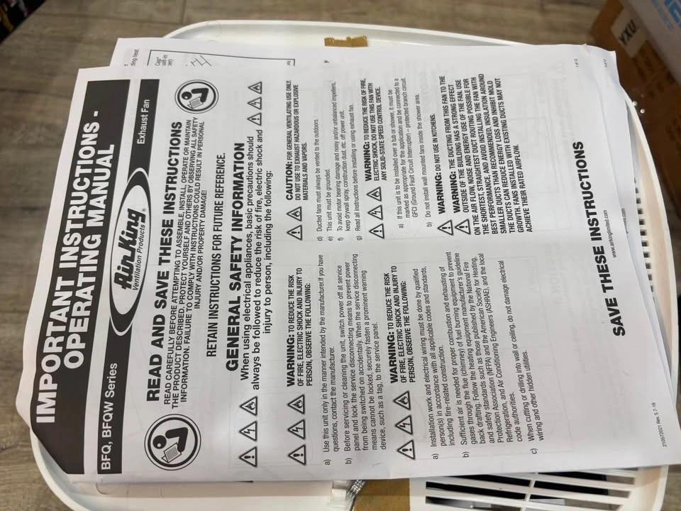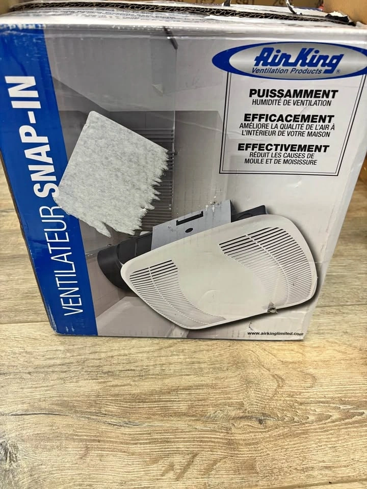 For sale is a brand new, never used Air King BFQ Series (Snap-In) bathroom exhaust fan. This unit is still in its original condition with the manual and all components included. This is a high-performance fan, much better than the basic builder-grade models. It’s perfect for effectively removing moisture and preventing mold in your bathroom. Key Features: • Performance: High-speed 100 CFM air movement. • Sound Level: 3.5 Sones. • Easy Installation: Features the "Snap-In" mounting system for quick and easy setup. • Durable Build: High-impact plastic housing that won't rust or corrode over time (perfect for high-humidity areas). • Duct Size: Works with a standard 4" round duct. • Certification: UL listed and high-quality motor. Condition: 10/10 (Brand New in Box / Never Installed). Price: $60 (Fixed). This is a great deal as these units typically retail for over $110 + tax. Save money on your next renovation project! Location: Richmond Hill.