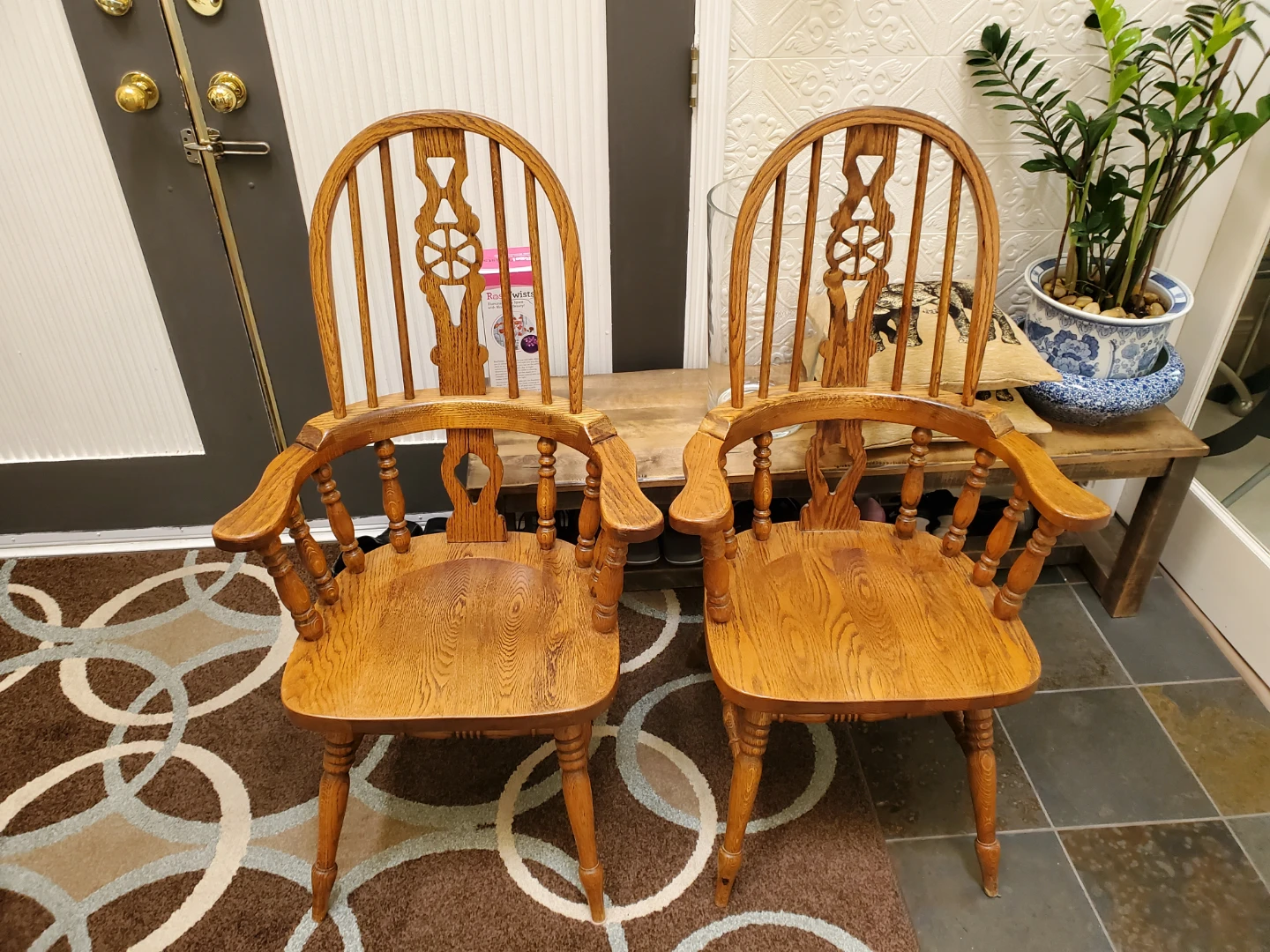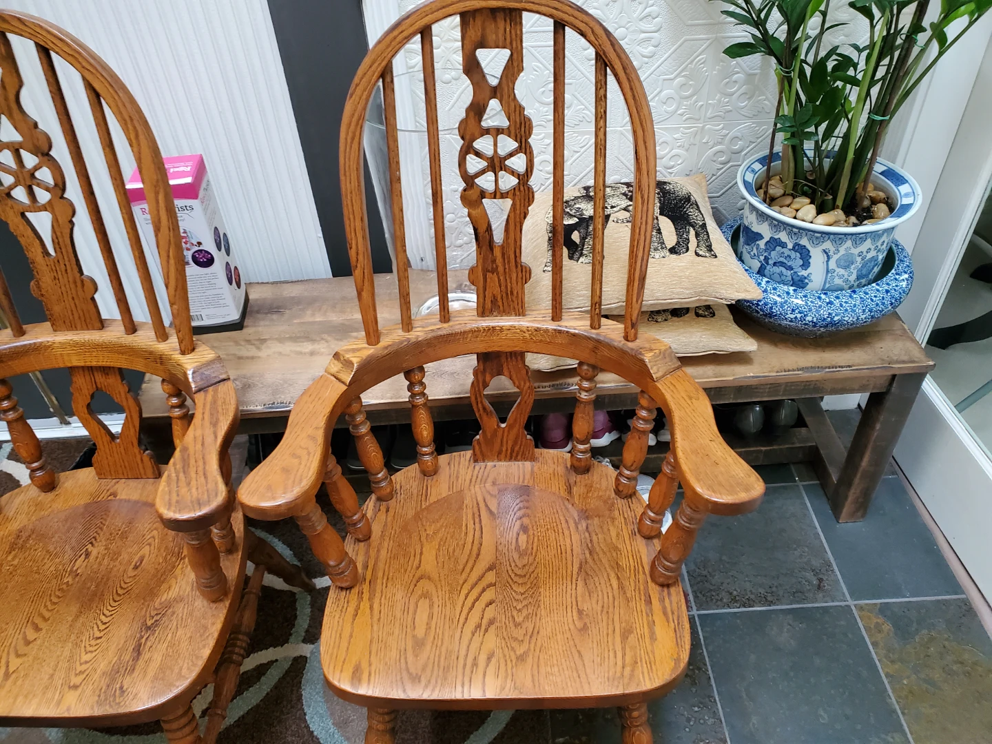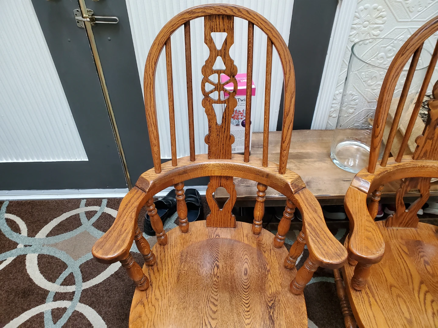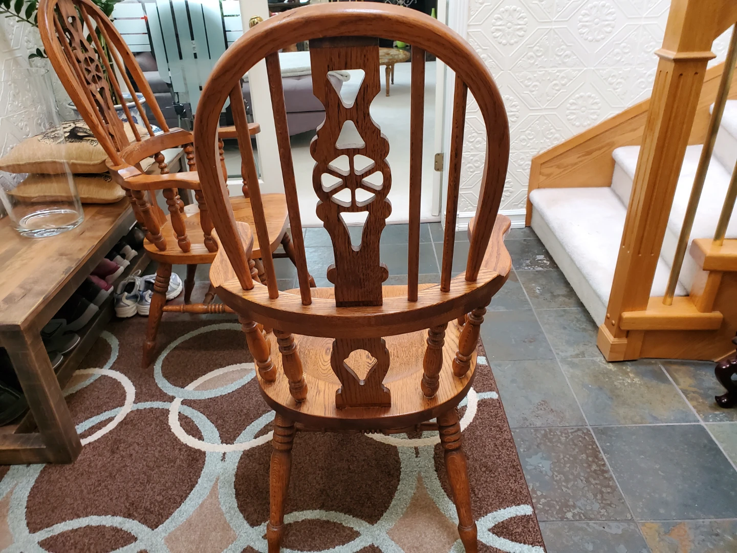 Solid wood armchair with a spindle back and curved arms. Oak wood construction. This chair is suitable for a dining room or accent seating.