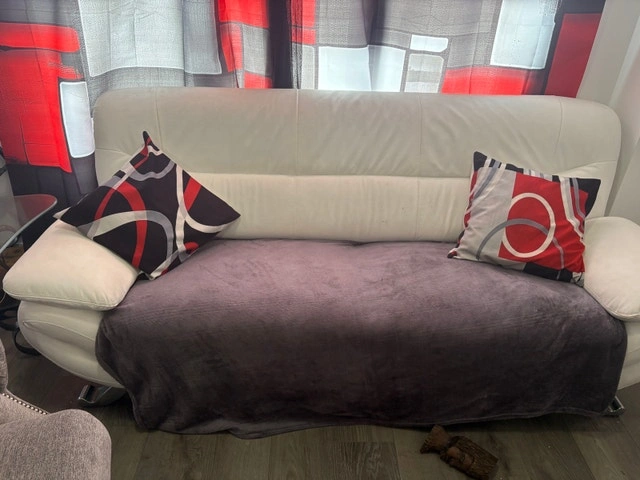 This is a stylish, modern white leather couch, perfect for adding a touch of elegance to any living space. It's a comfortable seating option. Note that this couch is in used condition and has some visible wear and tear, including some cracking, as shown in the pictures. White couches 76 by 34 inches and 56 by 34 inches. Condition: Used - Good. For Sale By: Owner. Cash accepted.