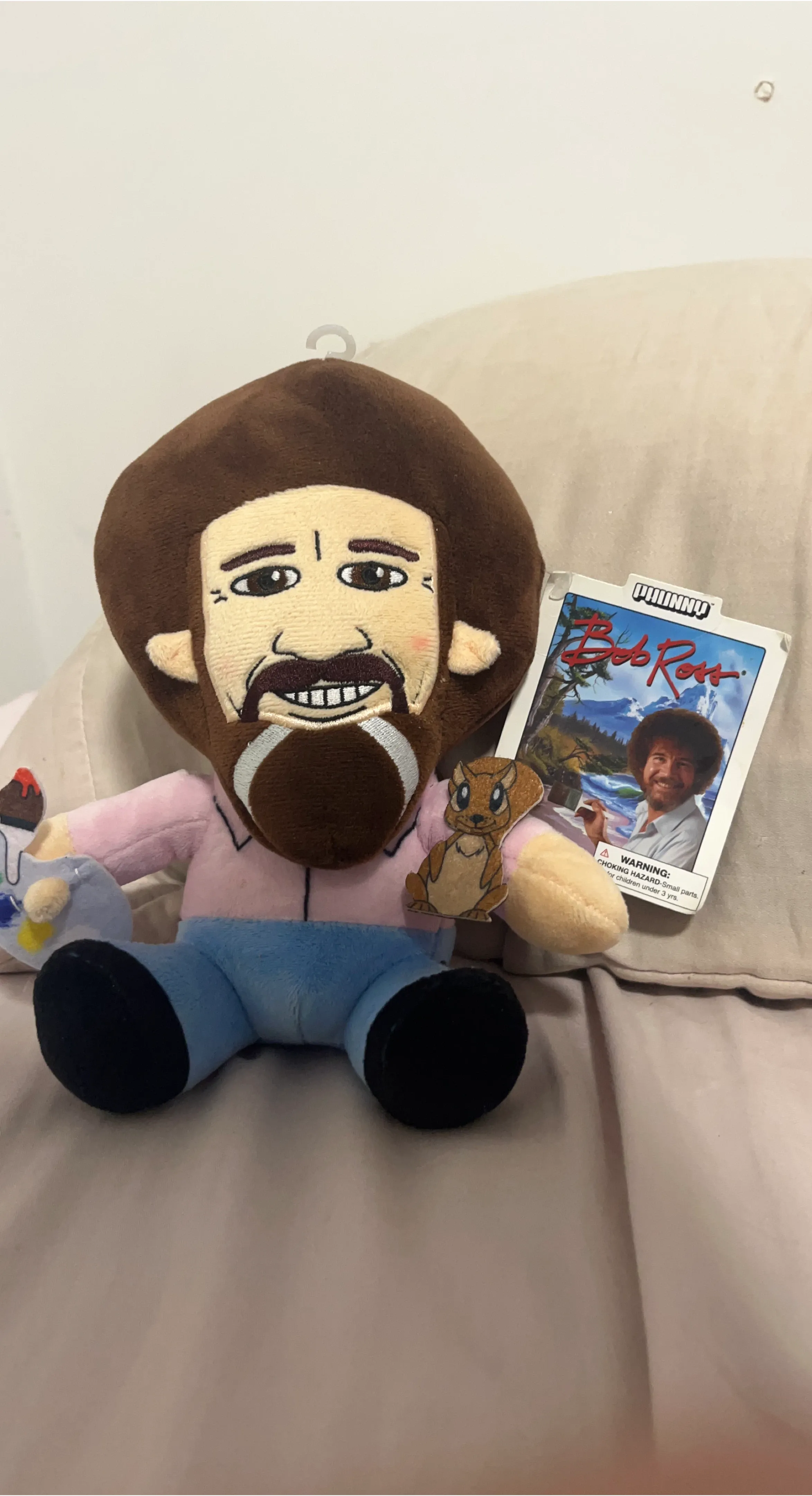 This is a plush toy featuring Bob Ross, complete with his iconic hairstyle, beard, and pink shirt. It also includes a small plush squirrel accessory. The plush is made of soft fabric.