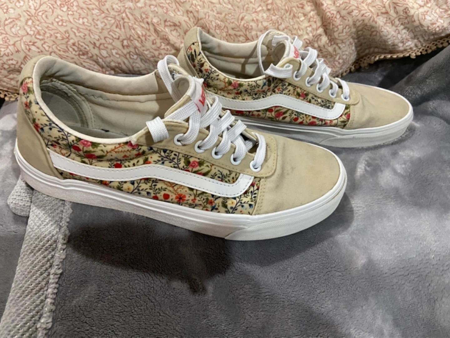 Classic Vans Old Skool sneakers in a tan colourway with a floral pattern. Features the iconic sidestripe and white laces. Made in Vietnam. US Women's size 10 (EUR 41.0, UK 7.5, CM 26.5).