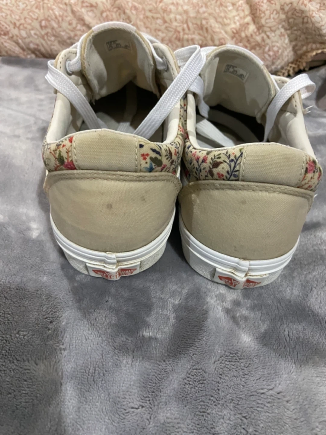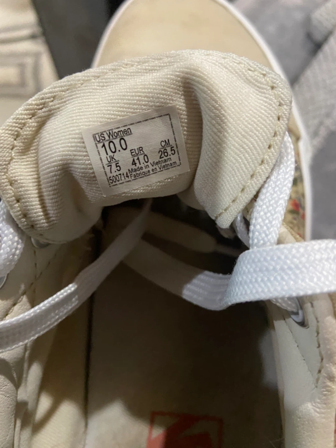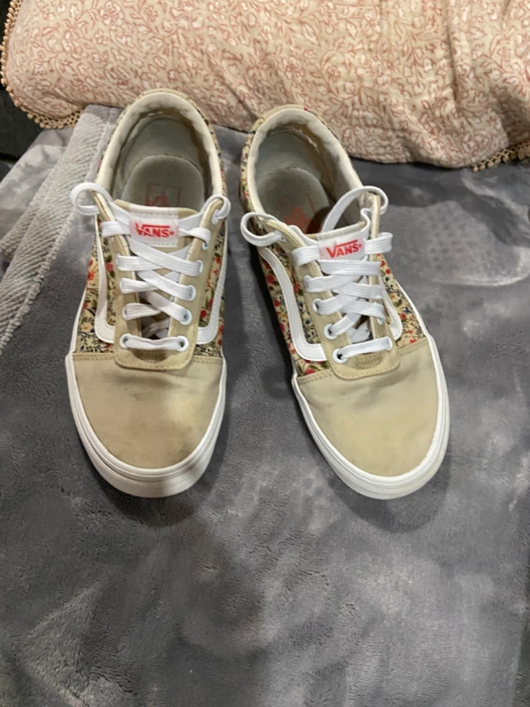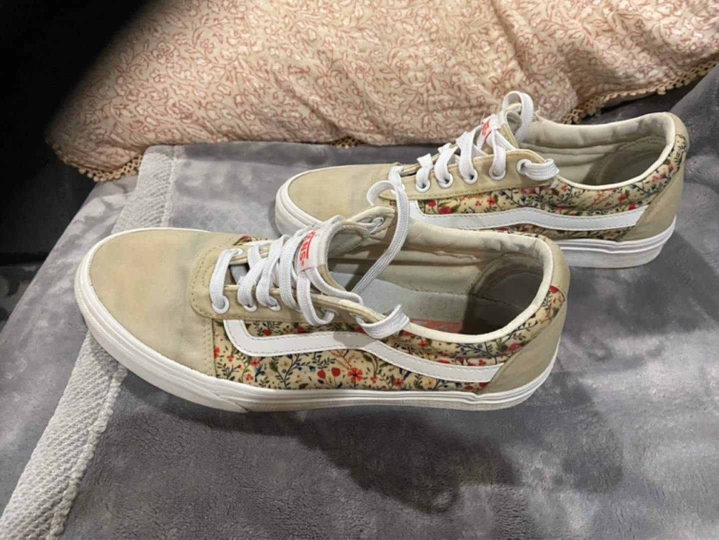 Classic Vans Old Skool sneakers in a tan colourway with a floral pattern. Features the iconic sidestripe and white laces. Made in Vietnam. US Women's size 10 (EUR 41.0, UK 7.5, CM 26.5).