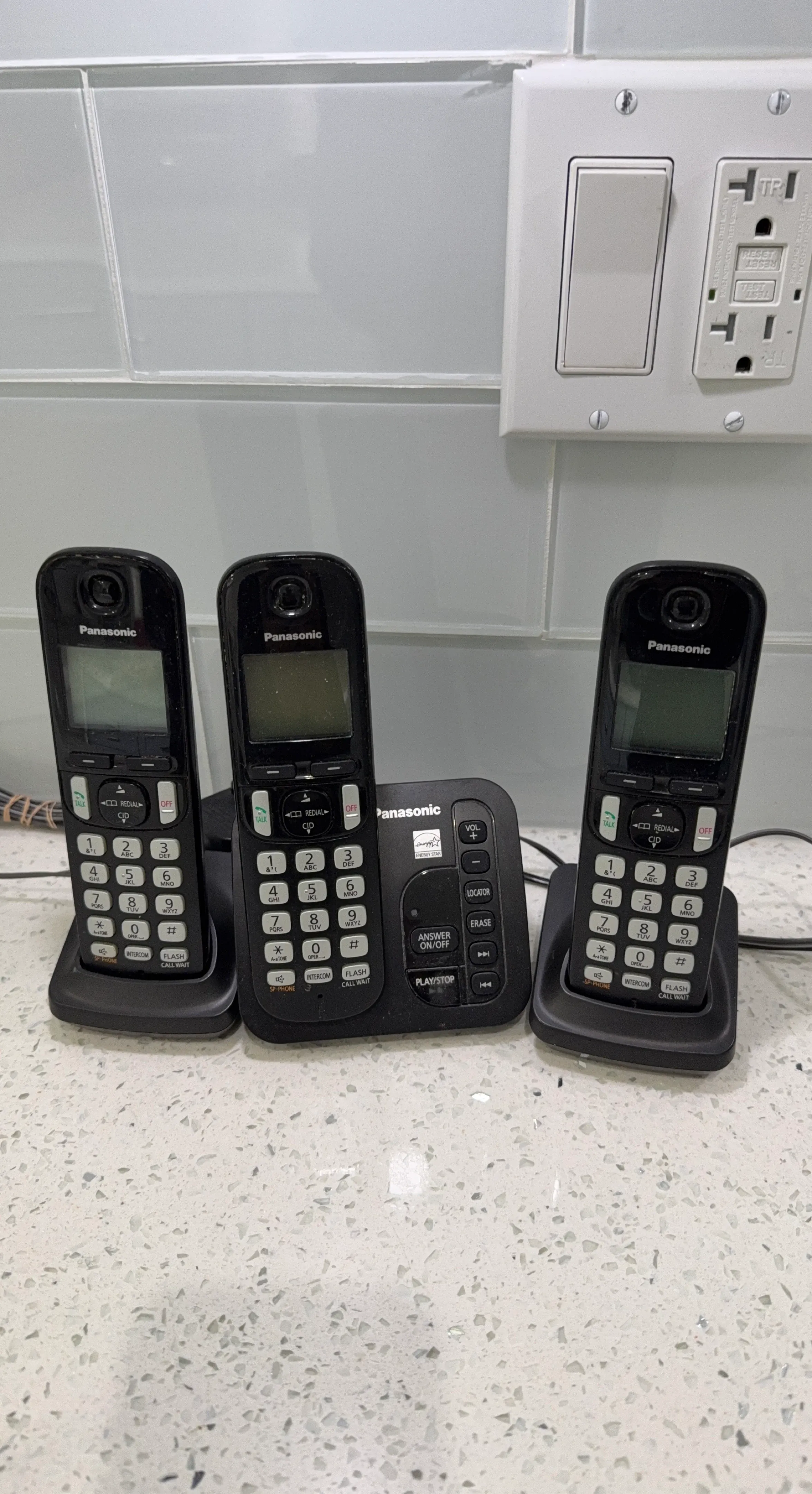 Panasonic cordless phone system with three handsets. Includes base unit and charging cradles. Black colour.