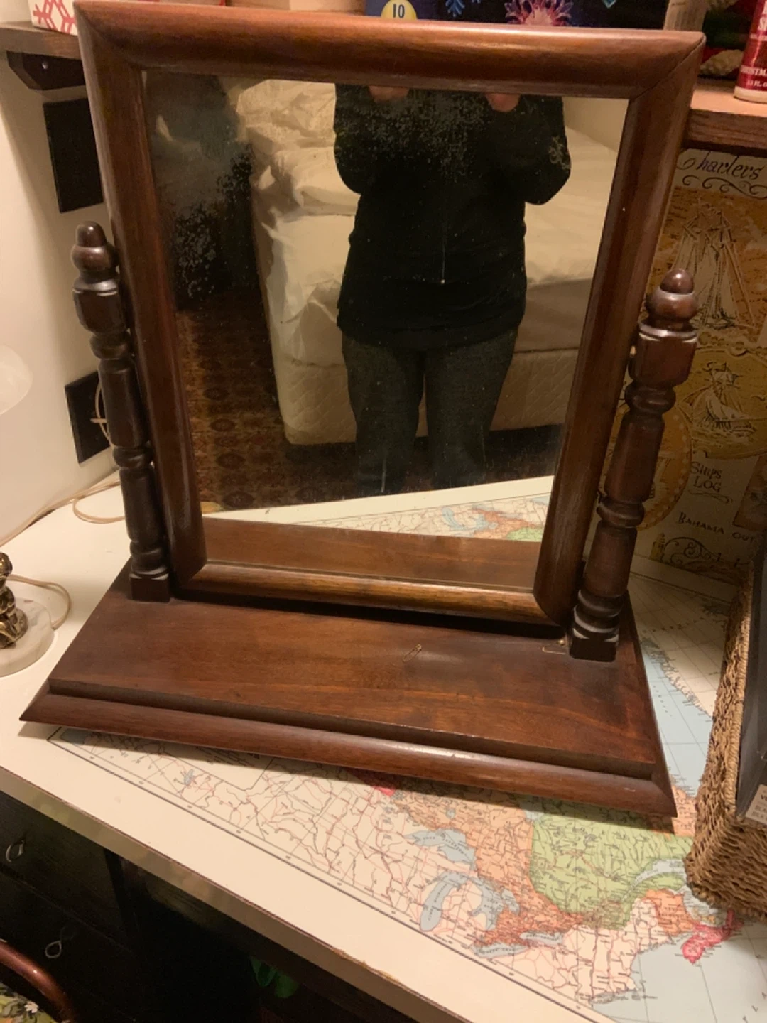 A vintage vanity mirror with a sturdy wooden base and frame. The mirror is hinged and can be adjusted. Its classic design makes it a nice addition to a dresser or vanity table.