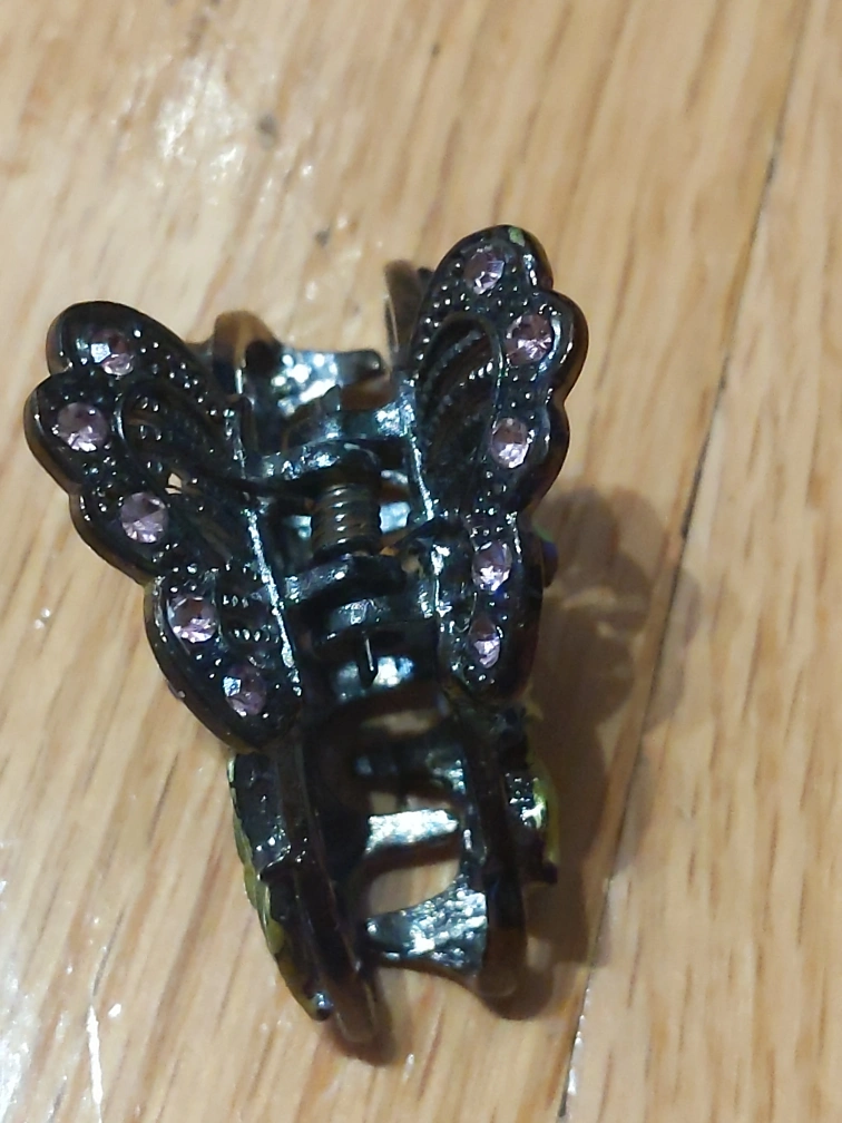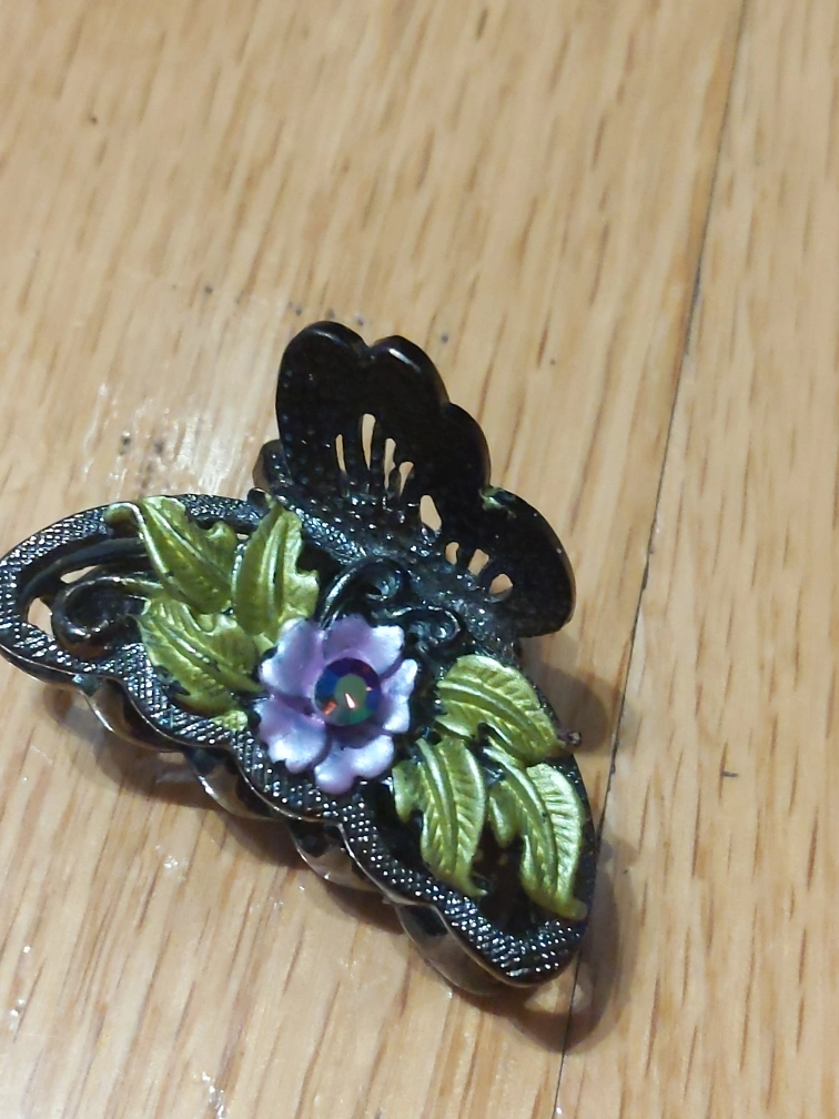 Here's a cute butterfly claw hair clip! It features a butterfly design with a flower and leaf accents. Perfect for adding a touch of whimsy to your hairstyle