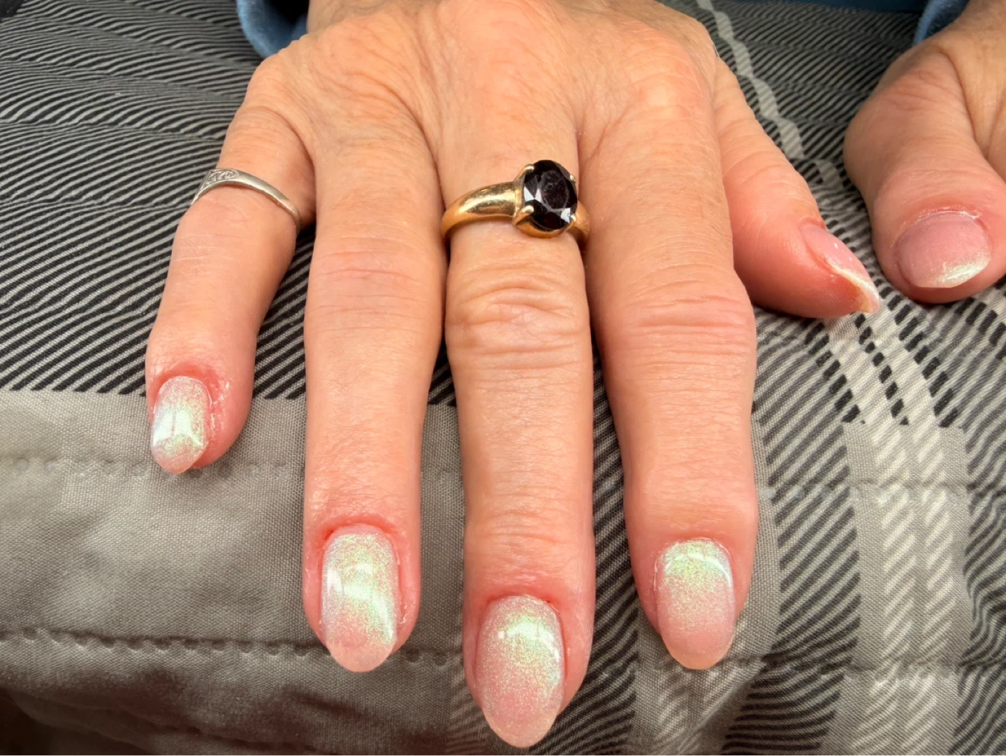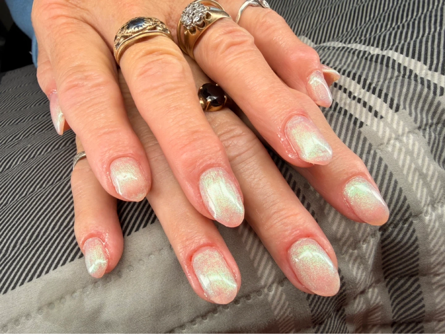 Beautiful pearlescent nail bio gel set with a subtle shimmer. These nails have a lovely iridescent finish. Perfect for adding a touch of elegance to any outfit!