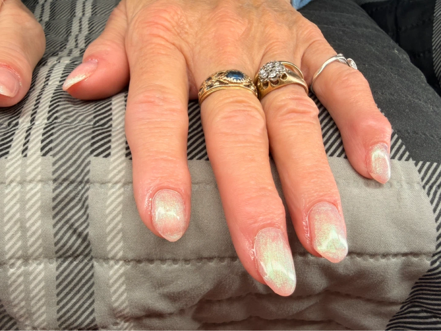 Beautiful pearlescent nail bio gel set with a subtle shimmer. These nails have a lovely iridescent finish. Perfect for adding a touch of elegance to any outfit!